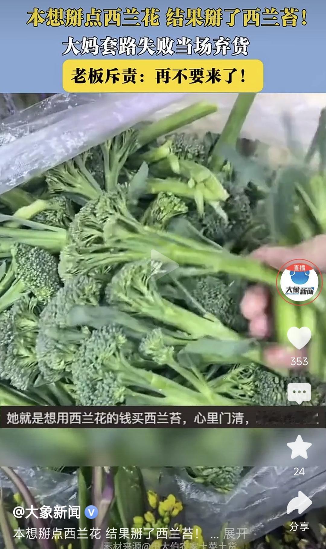 大妈把十几块的西兰苔当做西兰花掰掉 说给孙子做辅食 被工作人员发现还振振有词 坚持这就是西兰花 第一次知道还有西兰苔这个东西 好吃吗[捂脸][困][笑哭] 为啥总有大妈爱在超市以次充好 占点小便宜 现在大家也不缺吃不缺穿的 之前还看到有的大妈带着孙女 在超市随便吃那些散装零食 饼干瓜子什么的 这种行为也太可恶了 影响别人购物破坏超市商品不说 这对孩子也是非常错误的示范 以后孩子就会认为外面的东西 只要没有人看见就可以随便拿随便吃 小时偷针,大了偷金。 简直是不负责任的行为 聊聊大妈那些奇葩事 爷爷奶奶带娃 总爱占便宜的人是一种什么心态?