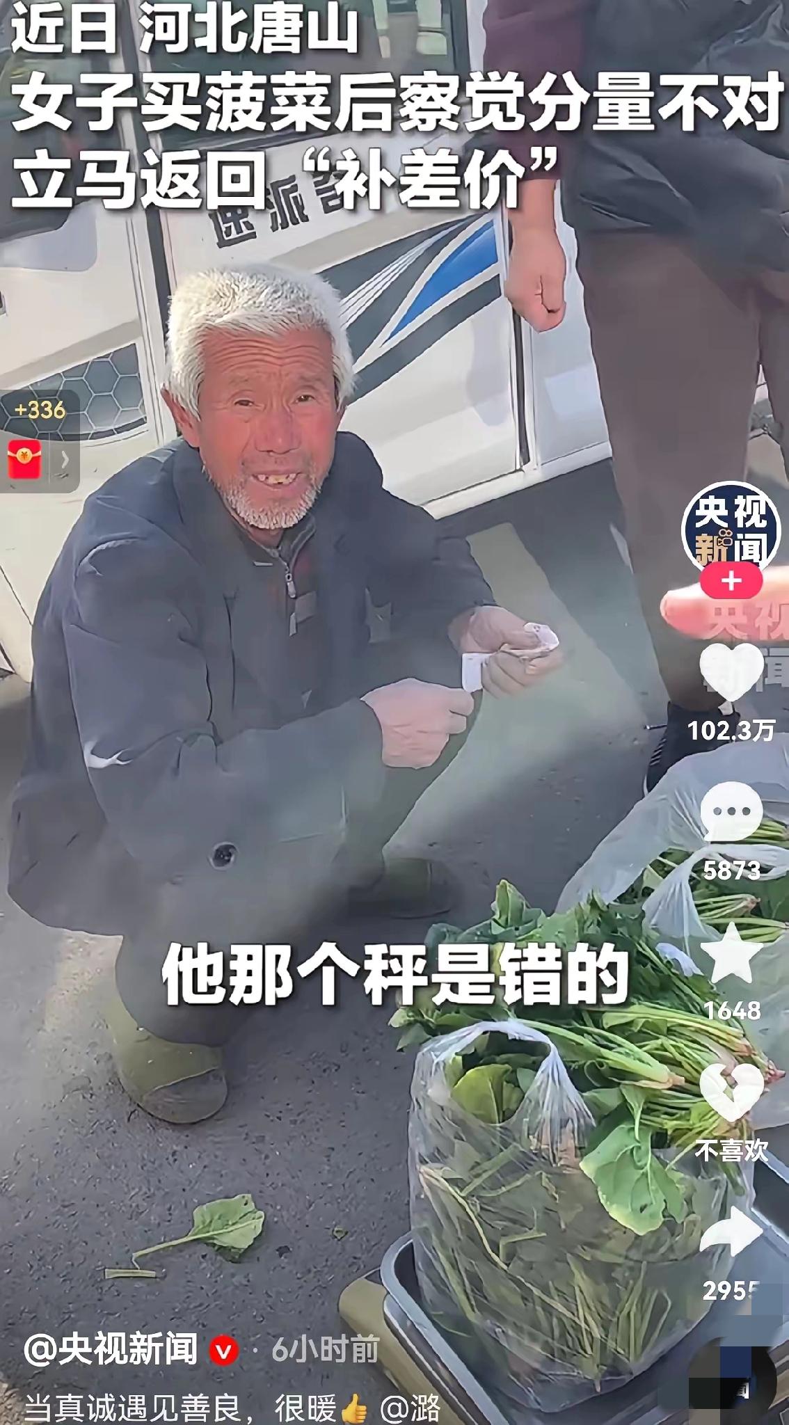 火到央视新闻了!近日,河北唐山的邵女士在一老爷爷的摊位上买了一斤菠菜,当老爷爷称完菜之后,就觉得不太对劲,回家一称发现,大爷把公斤秤当市斤用,一斤菜给了两斤,相当于白送一半。 换别人可能偷偷乐,她却立马骑车折返补差价,还蹲在摊前帮大爷调秤,怕老人后续卖菜一直亏。 旁边顾客见状也跟着补钱,大爷红着眼摆手说不用,那份实在藏不住对生活的热忱。 这哪是简单的补差价啊,是人心最真的底色——大爷不懂电子秤,却没想着缺斤少两;邵女士不嫌麻烦,不愿占辛苦人的便宜。 现在钱成了数字,很多人对几块钱不在乎,但这份“怕对方吃亏”的双向善意,才是最暖的人间烟火。 如果是你发现商家少收钱,会特意回头补上吗?来评论区说说!