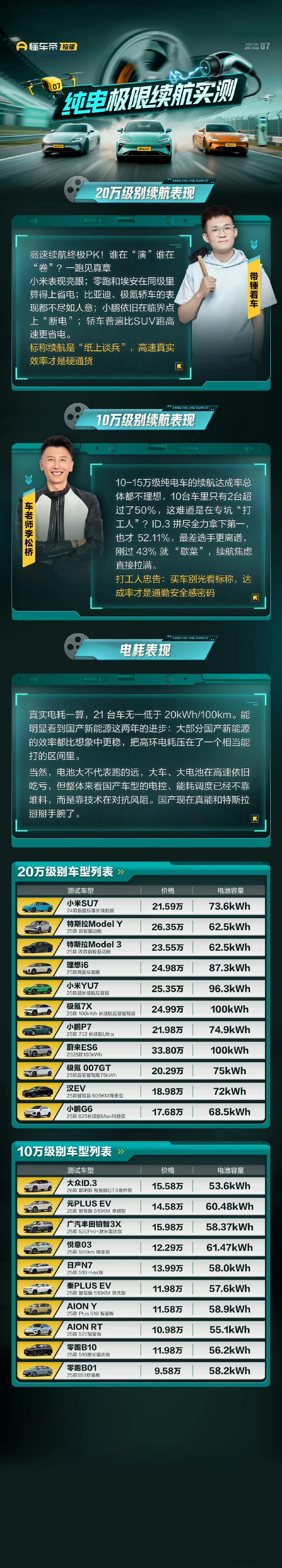 雷军回应小米汽车续航测试雷军今早发博,懂车帝极限测试实锤:21款纯电同台,小米YU7续航420公里全场最远,SU7达成率54.86%同级第一,YU7、SU7双车续航成绩优秀。120km/h高速、满载、低动能回收,硬核条件下的成绩也都够亮眼,面对质疑雷总不啰嗦,直接甩测试成绩截图打破质疑。 大V聊车
