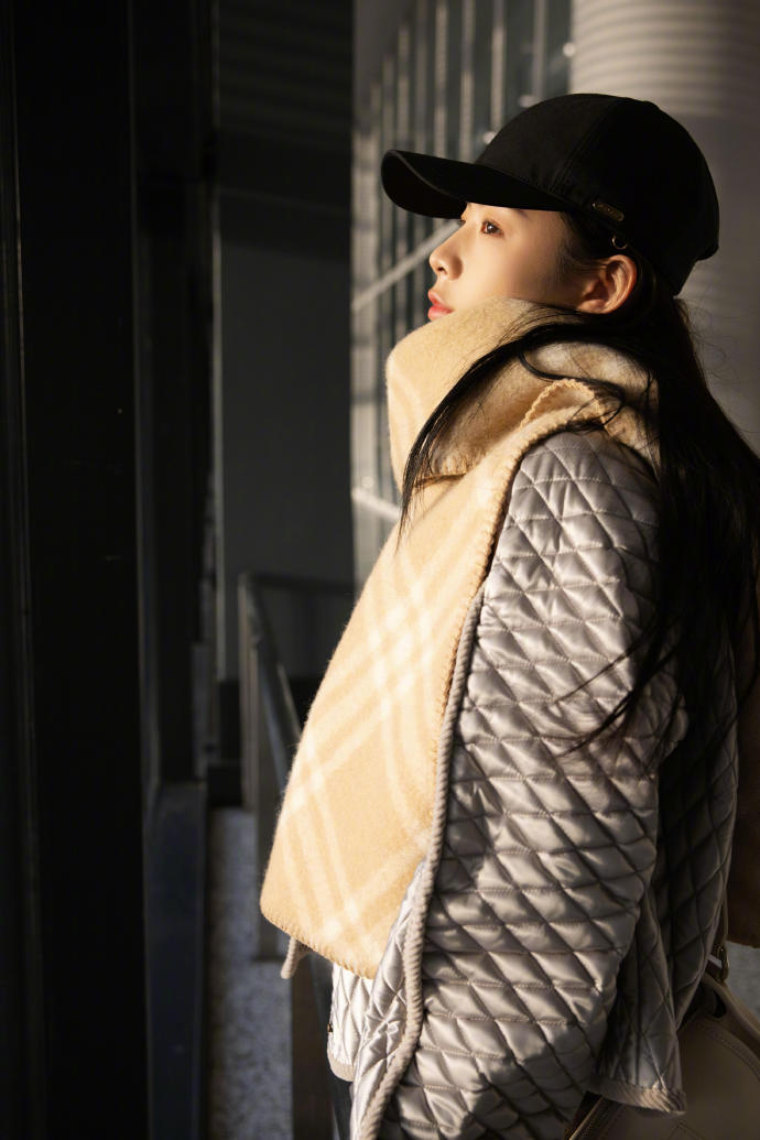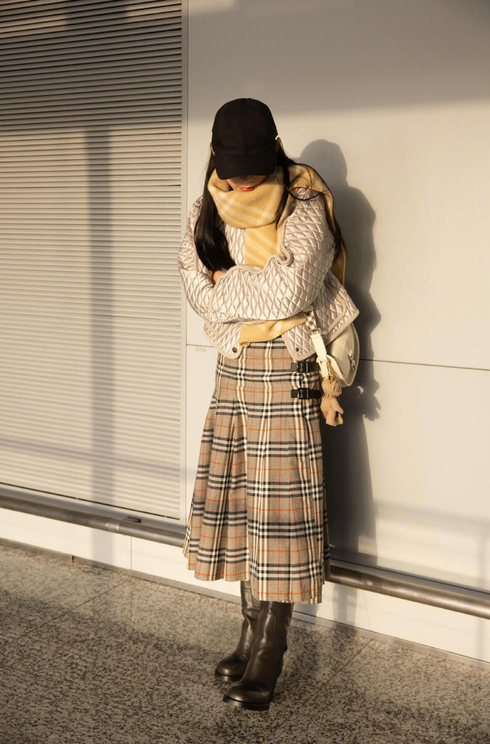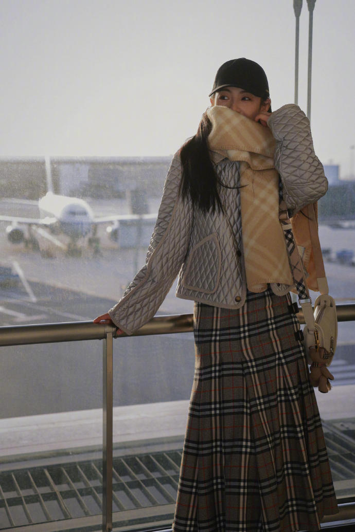 陈丽君机场Look演绎全套时装,身着Burberry菱形绗缝外套,搭配格纹半裙,亮点的羊绒围巾、高筒靴、单肩包。高级英伦格调,幻视留学归国的文静大小姐