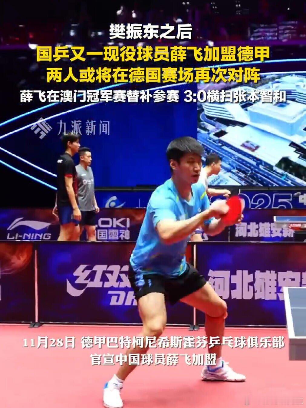薛飞加盟德甲樊振东之后,国乒又一现役球员薛飞加盟德甲,曾在澳门冠军赛替补参赛,3:0横扫张本智和。