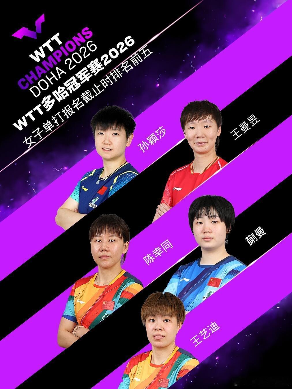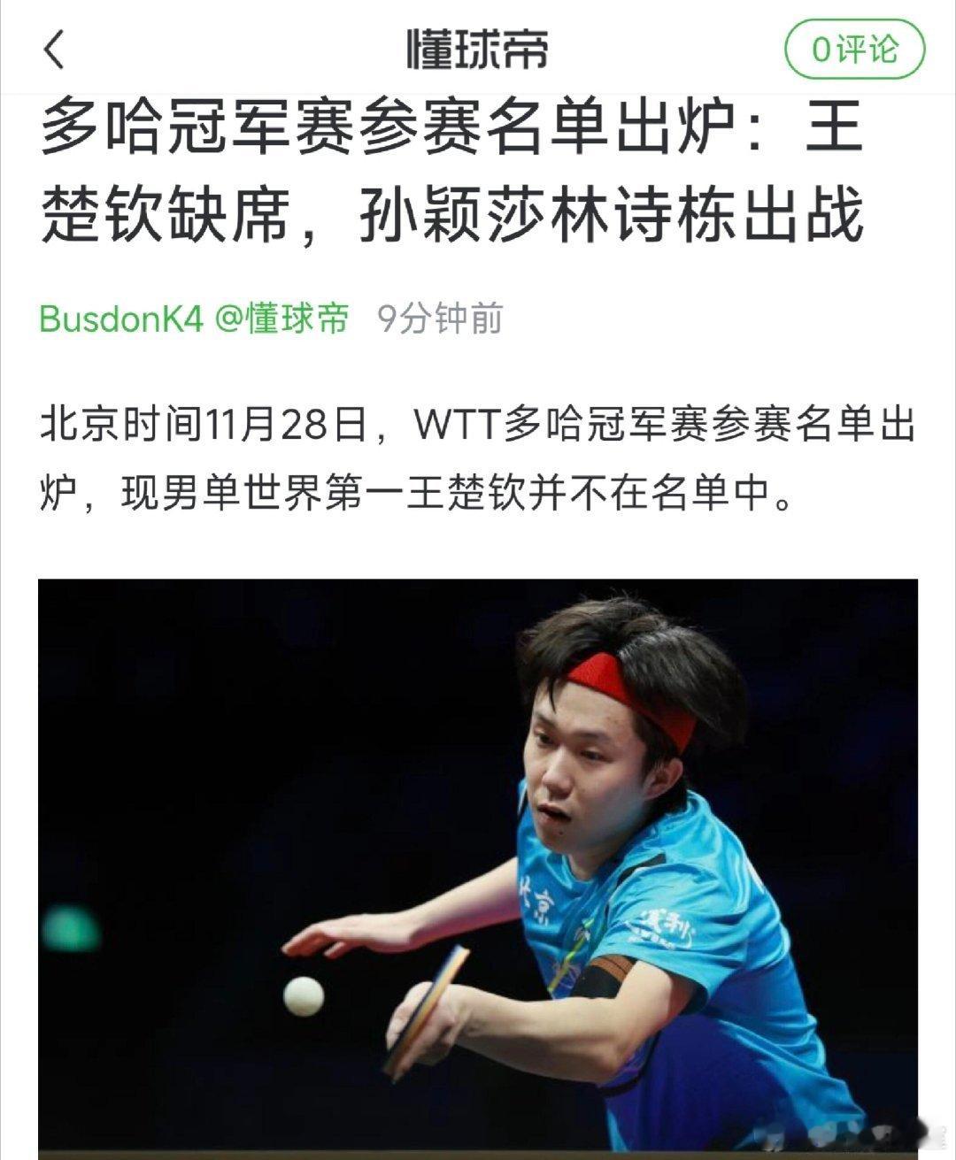 孙颖莎林诗栋领衔多哈冠军赛参赛名单北京时间11月28日,WTT多哈冠军赛参赛名单出炉,现男单世界第一王楚钦并不在名单中。WTT多哈冠军赛2026将于1月7日至11日在卢赛尔体育馆举办。男单这边,林诗栋、雨果、莫雷加德、张本智和等一众名将悉数在列;女单这边,孙颖莎、王曼昱、陈幸同、蒯曼和王艺迪全员参赛。王楚钦在前不久结束的第十五届全运会中收获了男团金牌和男单铜牌。全网热点共创计划