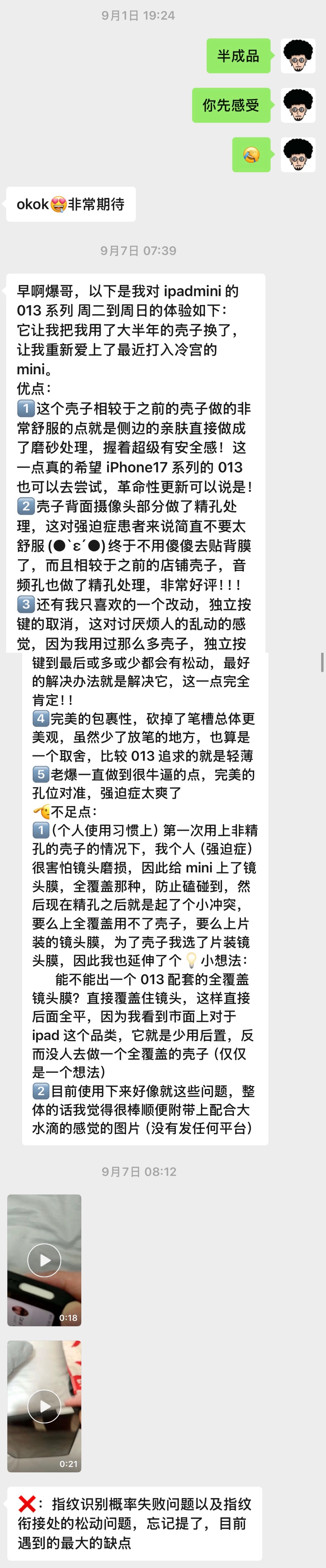 iPadmini6 013第一个用户给我的反馈。那时候还是9月份,我以为可以量产了,我就发给了一位朋友体验,他看问题很细致,我想听听他的看法。他给我发来了很详细的体验分享,提到了指纹按键不太好按。其实还有一些细节地方他没有提出来,所以后面又烧焊了一下模具指纹按键,改到更好按了。现在的样子,我觉得除了有一点点合模线外,其他我都很满意了,一锤定音。
