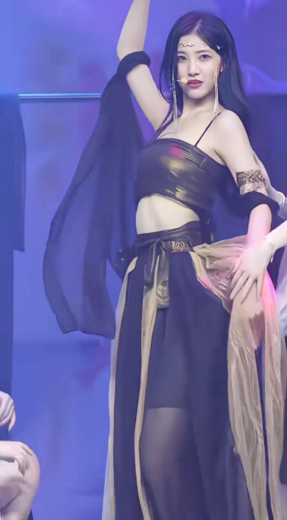舞台灯光揉碎在裙摆的金纹里,袖间纱幔随动作轻晃,她抬手的瞬间,像把夜色裁成了摇曳的诗。唇上那抹红是鼓点里最亮的星,耳坠垂落时,连呼吸都沾了几分舞台的热烈。