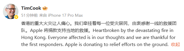 库克微博宣布苹果将捐款支持香港