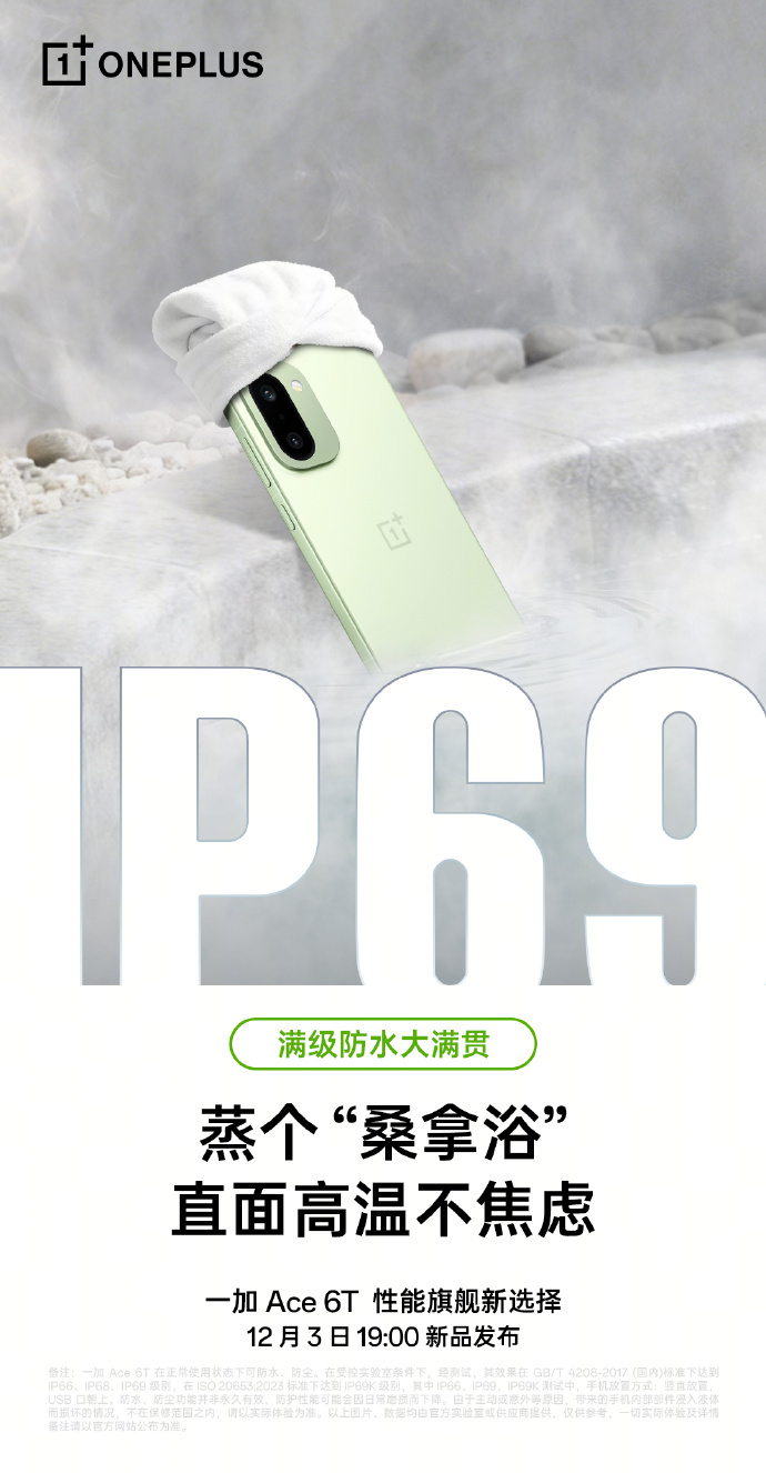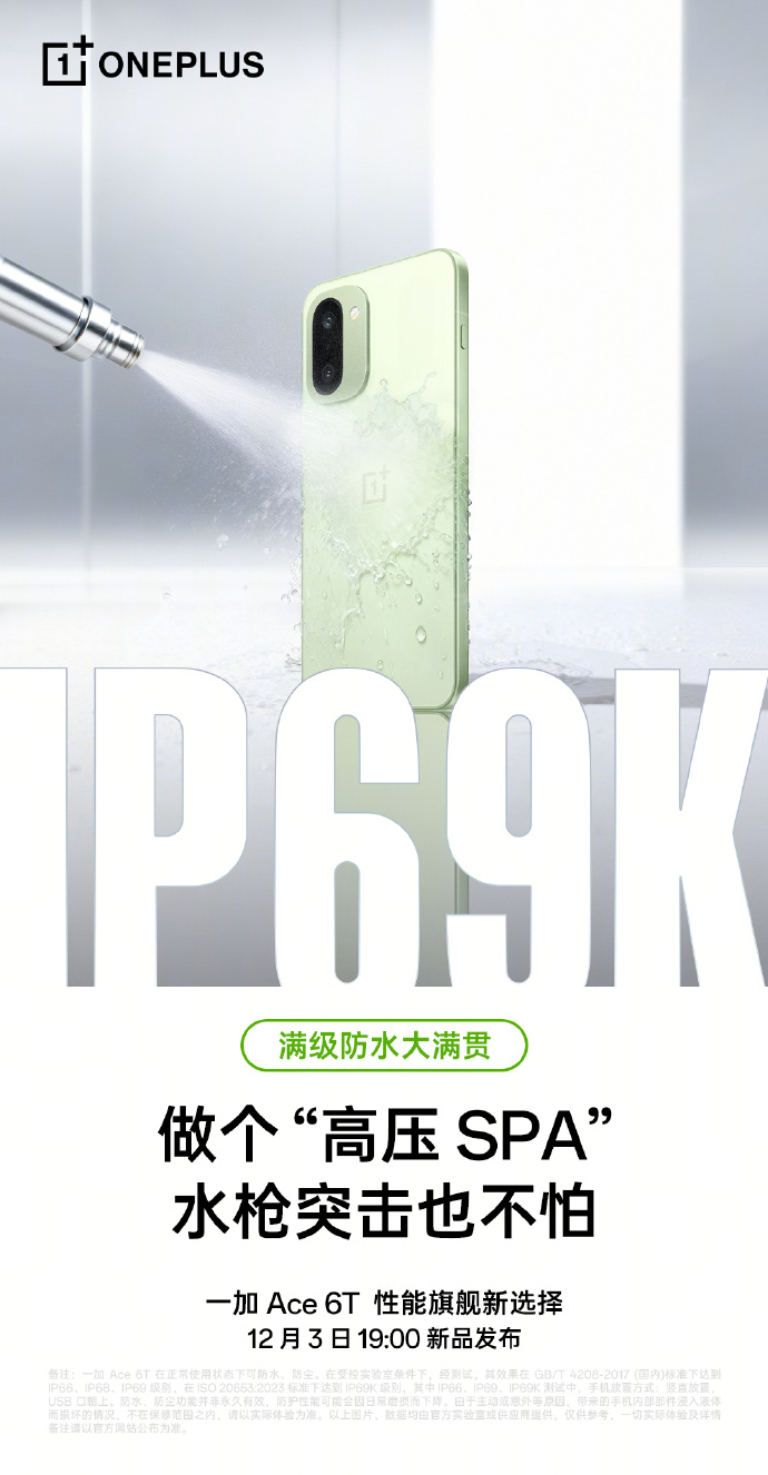 一加Ace6T支持 IP66、IP68、IP69、IP69K满级防水