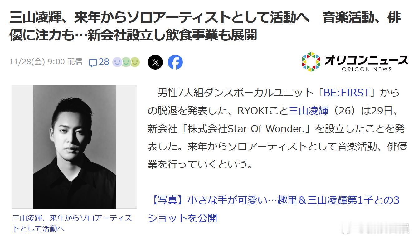 退出BE:FIRST的三山凌辉成立新公司“株式会社Star Of Wonder.”。他本人将以solo艺人身份开展音乐活动与演员工作。