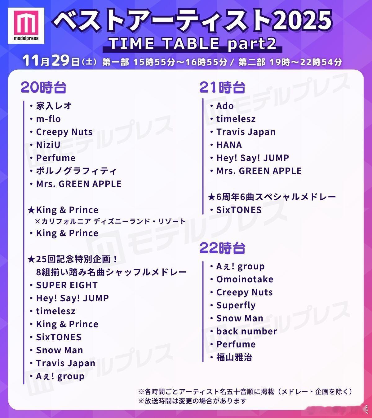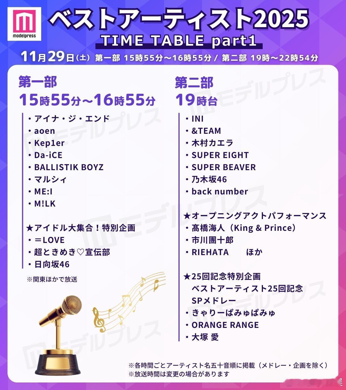日本电视台音乐特别节目《Best Artist 2025》(11月29日直播)公布时间表。【出演艺人】INI / アイナ・ジ・エンド / aoen / Ado / 家入レオ / =LOVE / Aぇ! group / m-flo / &TEAM / 大塚愛 / Omoinotake / ORANGE RANGE / 木村カエラ / きゃりーぱみゅぱみゅ / King & Prince / Creepy Nuts / Kep1er / SUPER EIGHT / SUPER BEAVER / Superfly / SixTONES / Snow Man / Da-iCE / timelesz / 超ときめき♡宣伝部 / Travis Japan / NiziU / 乃木坂46 / back number / HANA / Perfume / BALLISTIK BOYZ / 日向坂46 / 福山雅治 / Hey! Say! JUMP / ポルノグラフィティ / マルシィ / ME:I / Mrs. GREEN APPLE / M!LK