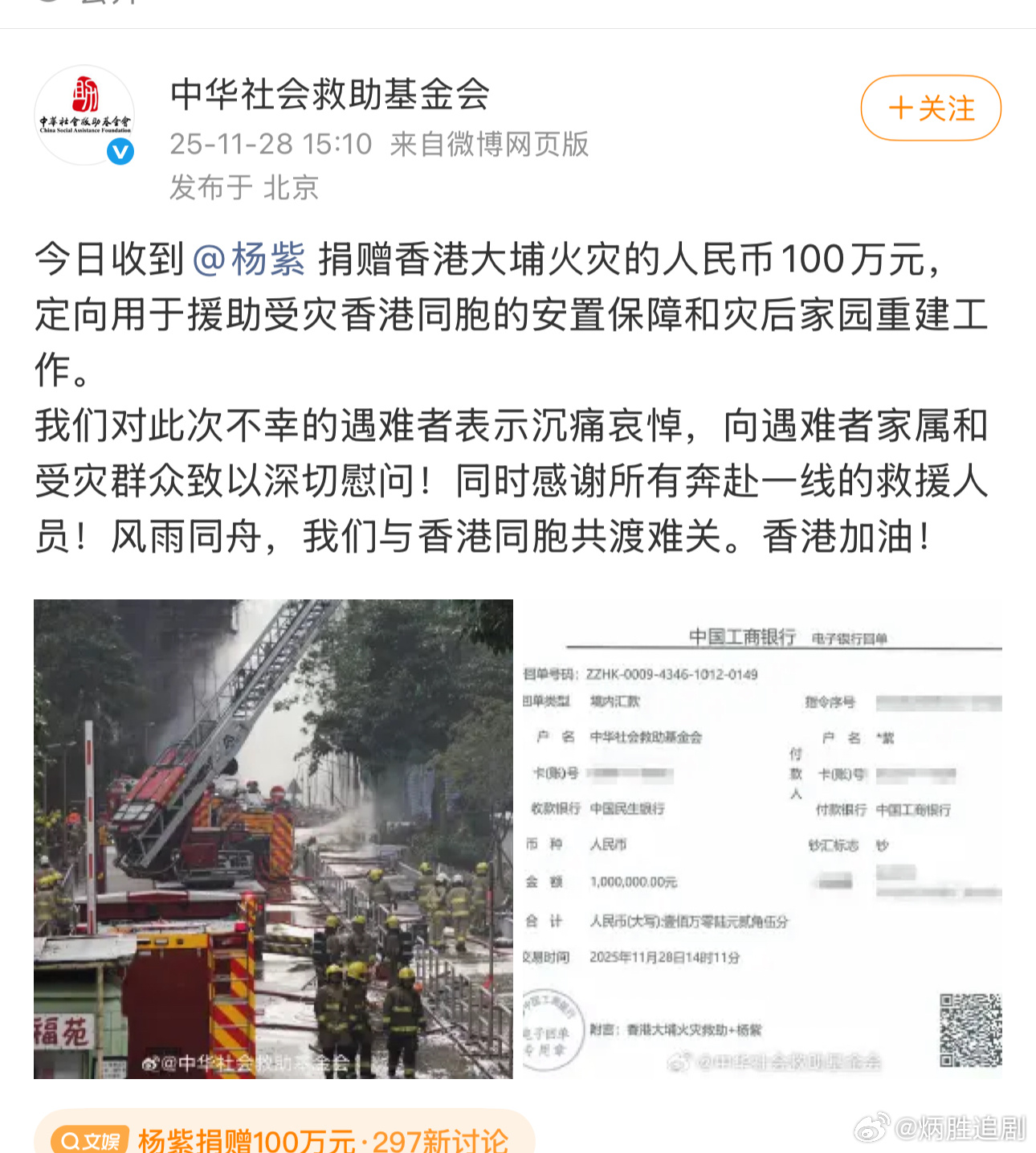 杨紫向香港大埔火灾的人民币100万元杨紫捐赠100万元