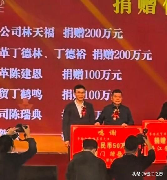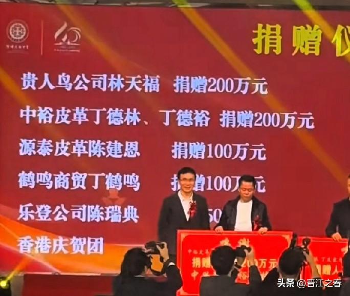 福建晋江陈埭民族中学建校60周年之际暨首届校友会庆典,收到各界乡贤、爱心人士、企业家、华侨、校友的捐款达2.2亿元人民币! 安踏和敏基金会捐赠1.3亿元 特步集团丁水波捐赠500万元 安安公司张文彩捐赠500万元 三斯达公司丁金山捐赠500万元 利奥公司丁灿捐赠500万元 民族中学校友会捐赠500万元 贵人鸟公司林天福捐赠200万元 中裕皮革公司丁德林、丁得意捐赠200万元 钟浪科技丁友家捐赠200万元 元泰皮革陈建恩捐赠100万元 鹤鸣商贸丁鹤明捐赠100万元元登公司捐赠100万元 菲律宾庆贺团捐赠100万元 香港庆贺团捐赠100万元 茂泰公司丁子虎捐赠100万元 美克公司丁恩强捐赠100万元....及各位乡贤的捐款,善款已达2.2亿元。 晋江人历来对教育事业非常重视,以助学兴教为己任! 晋江的学校几乎全部都是乡贤、企业家、华侨捐建的! 情系桑梓报春晖,兴学助教暖人心! 晋江不愧是七星级的慈善城市,晋江人的慈善基因深入骨髓,薪火相传,爱心永续!