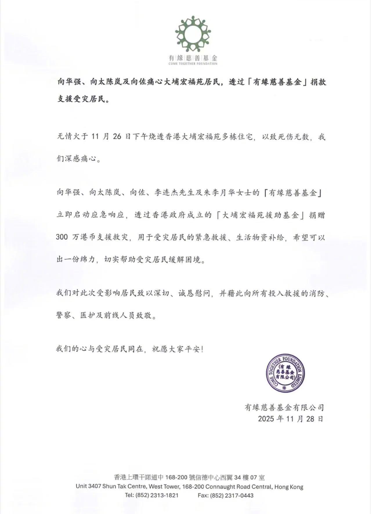 11月28日,向华强、、向佐及国际功夫巨星等人捐赠300万港币,用于支持紧急救援及受灾群众的生活物资补给向佐全家与李连杰捐款300万港币向佐全家与李连杰为香港捐赠300万港币
