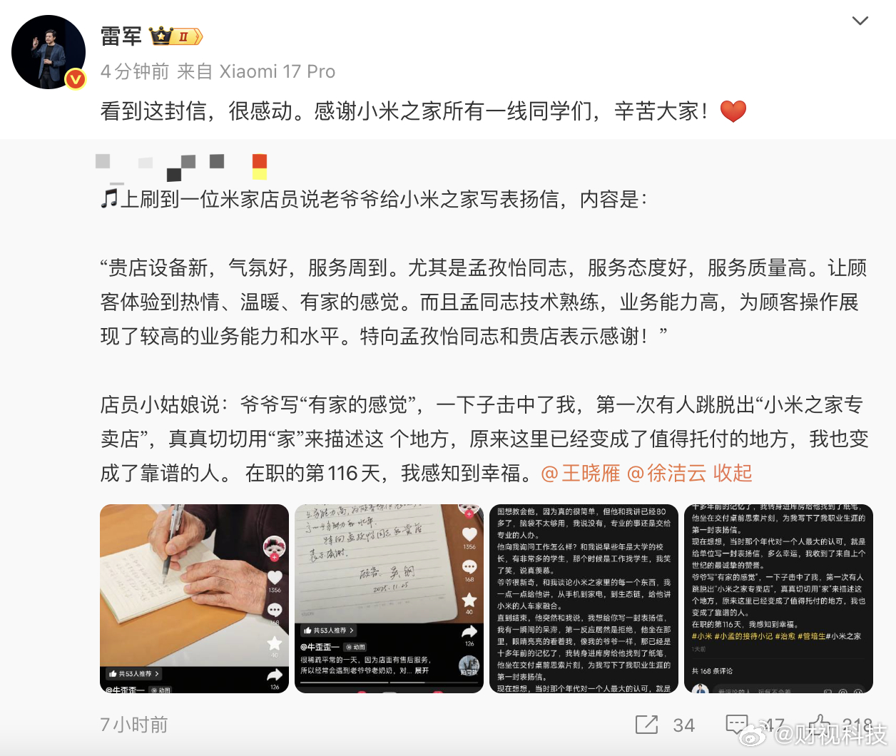 【雷军被老爷爷手写表扬信感动】老爷爷手写表扬信感动雷军11月28日,有网友发帖称