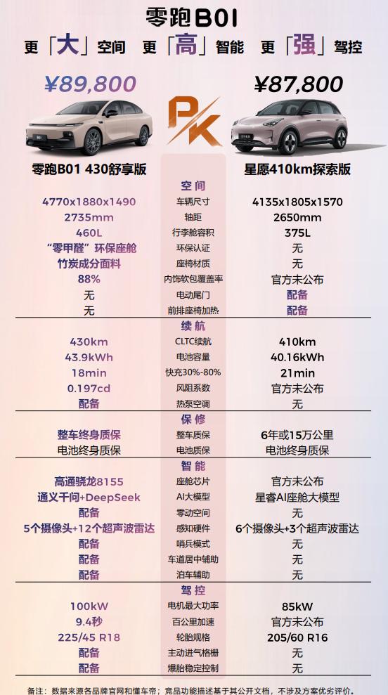 10万内选纯电车,吉利星愿高配还是零跑B01入门款? 其实这压根不是“鸡头凤尾”的选择题,而是“普通代步”和“越级享受”的天壤之别! 星愿在这个价位确实算合格代步车,但零跑B01可是10万级家轿市场的爆款,就算是入门款,底子也比同级厚实太多。就说大家最关心的续航,10万内预算,B01直接给到550km续航,快充18分钟。而星愿顶配才410km,快充还得21分钟。每天通勤30km的话,B01能比星愿多撑4天不用充电,就算偶尔跑个小长途,也不用慌慌张张找充电桩。要是预算能到10万+,B01还能解锁650km超长续航,续航焦虑直接清零。 智能配置更是降维打击!零跑B01入门就标配8155芯片,还有双语音AI大模型,语音交互又快又准,这可是星愿全系都没有的配置。要是预算再往上提,B01还能上8650+8295双旗舰芯片,加上激光雷达辅助驾驶,开起来又智能又省心。 总结下来,同等预算,星愿只能满足基础代步,而B01能给到更长续航、更智能的配置,这种越级优势真的肉眼可见。选谁更值,答案已经很明显啦!
