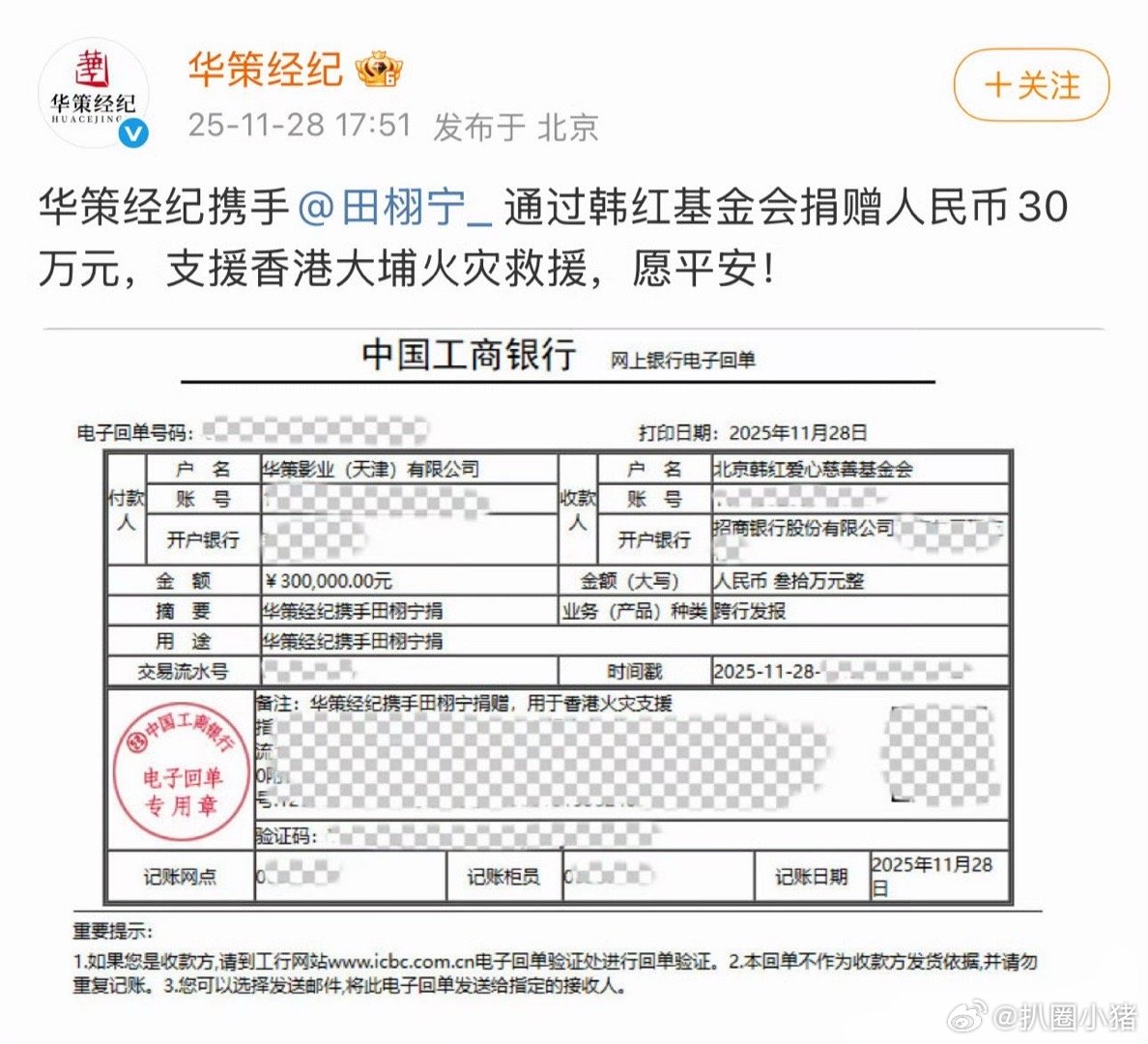 田栩宁捐赠30万元支援香港大埔火灾救援!愿平安!