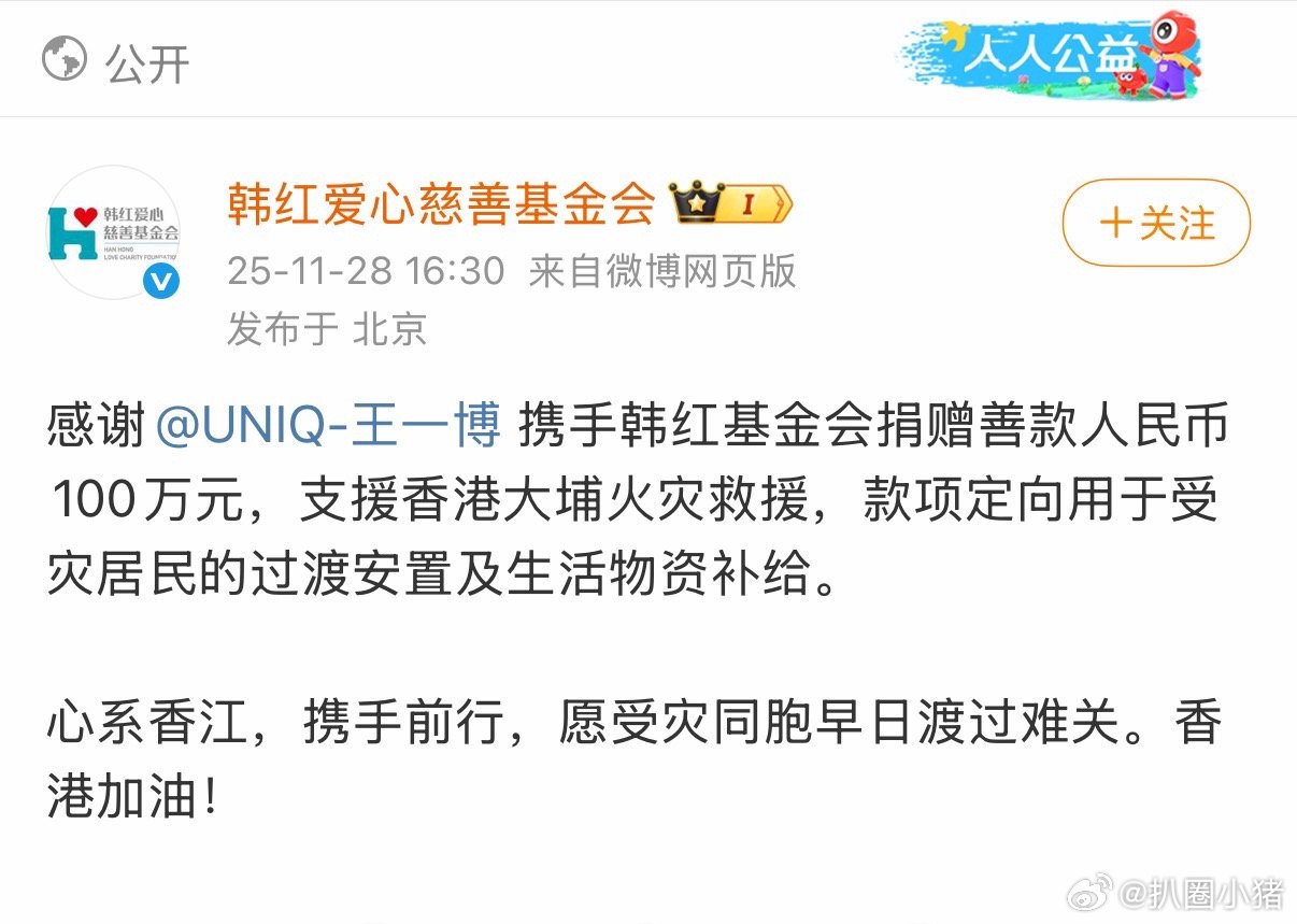 易烊千玺捐款100万元驰援香港!愿受灾同胞早日渡过难关,重建家园。衷心祈愿平安,