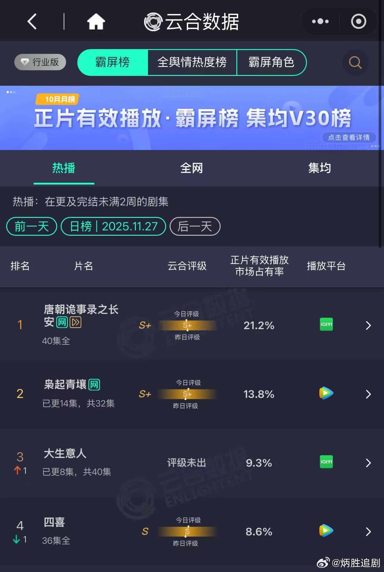 迪丽热巴《枭起青壤》已经播出一周了,热度彻底上不来了。很可惜,迪丽热巴还是没能通过S+作品实现扛剧能力的验证。接下来的路感觉会很难,但是爱丽丝一定会不离不弃,2026年可以常驻一个综艺节目会更稳妥。
