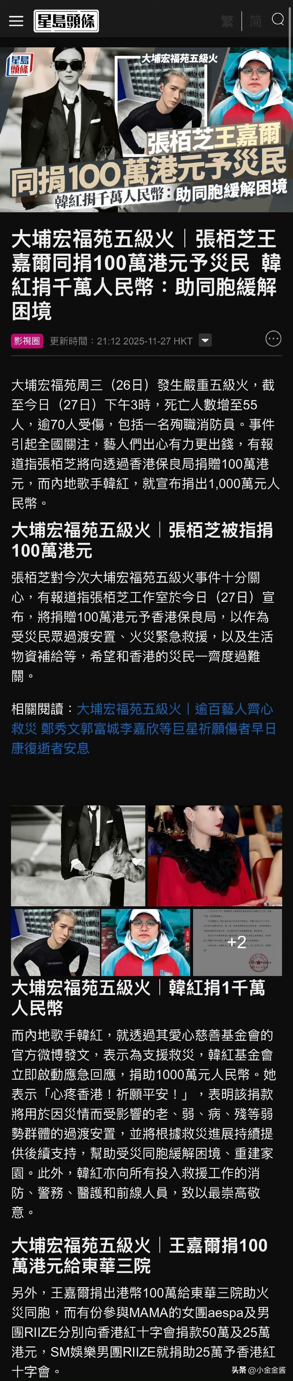张杰谢娜,连夜冲上热搜。 11月28日,就在大家关心香港火灾时,谢娜两夫妻,却悄悄冲上热搜,这一次,不是因为秀恩爱,而是一个举动,颠覆了大众的认知,网友一看,纷纷炸开了锅。 怎么回事?[泣不成声] 11.28号凌晨,大家都进入梦乡时,中华慈善总会发文:张杰、谢娜捐款100万,用于香港大埔火灾的救援和安置,此发文一出,瞬间冲上热搜,夫妻俩太让人敬佩了。 之前在娱乐圈,谢娜一直走“抠门”人设,多次被爆料借钱忘记还,没想到,在大是大非面前,夫妻俩非常拎得清,100万说捐就捐,这个举动,真的狠狠圈了一波粉,如今的谢娜,也不算顶流了,赚钱也不容易,而张杰,努力开演唱会,还要养家糊口、养3个女儿。 除了张杰谢娜,张柏芝、周深、王嘉尔也纷纷捐款100万用于灾后重建。 为这些艺人点赞。[握手][赞][机智]