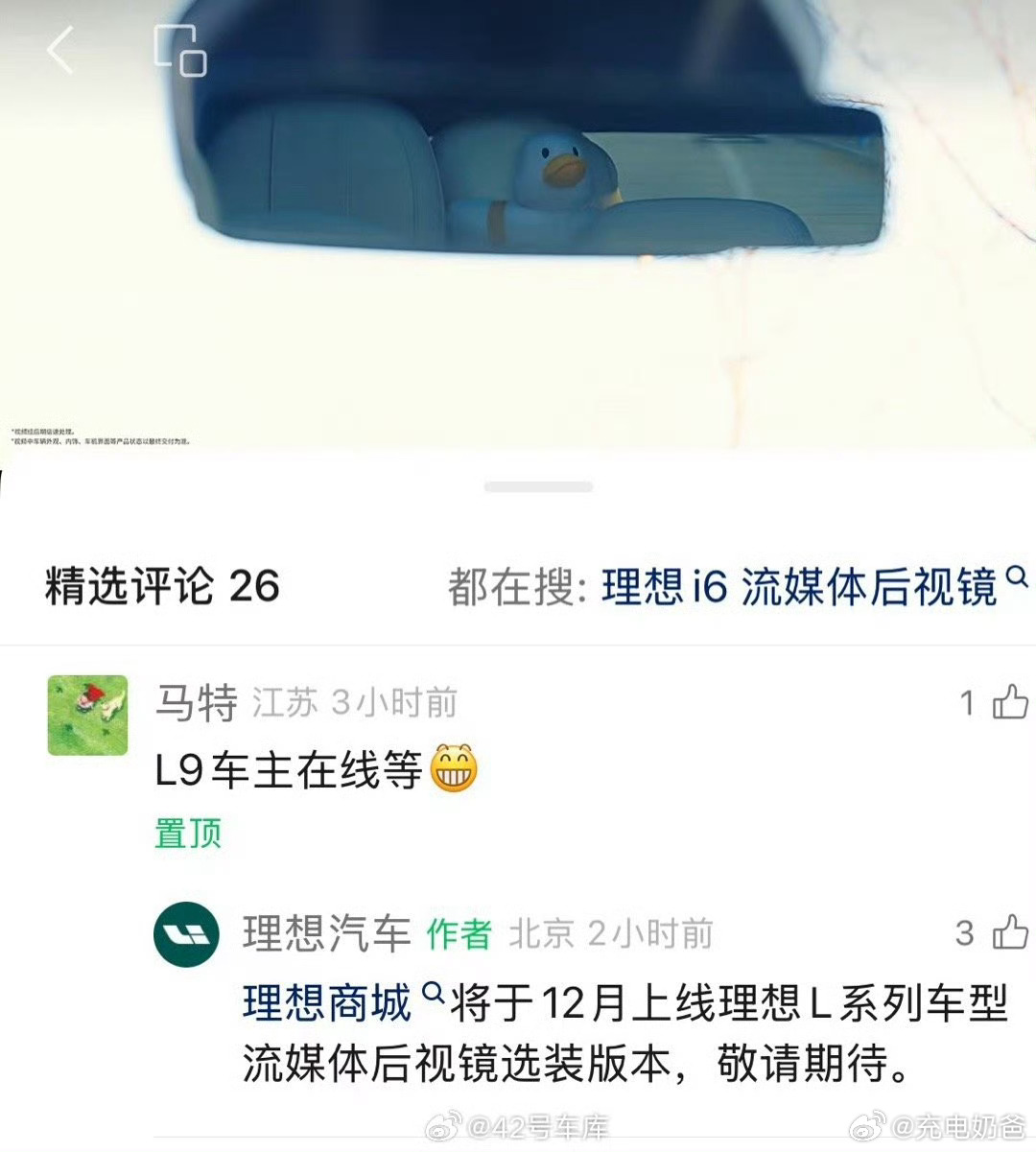 1.公布理想 i6 等车关怀方案:对于因我方原因超期交付的用户,我们将提供600积分/日的补偿,并对已提车用户进行追溯。2.流媒体后视镜选装方案将于 12 月上线 L 系列,大家会选吗?理想汽车
