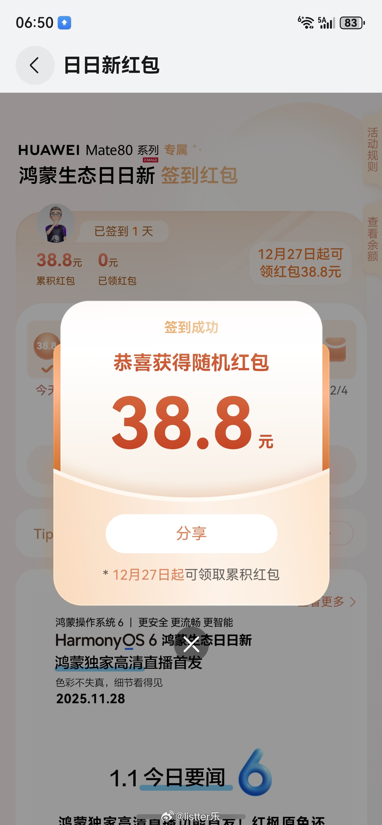 华为Mate80 Pro激活后第一件事就是开启日日新红包,第一天领到38.8,据