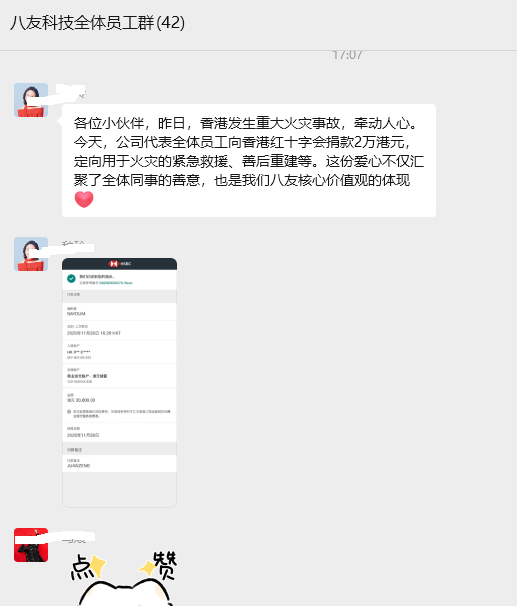 除了厂里和我个人的捐款,香港公司(5名)员工也积极参与了捐款,每人几百港币不等。香港给了我厂还是非常多的机会,给我们出海国际化一个重要支点,屡收海外羊毛。今天香港火宅群众有难,捐款是应该的,全厂职工(42名)看到厂里捐款,都非常自豪,感觉也出了一份力。。