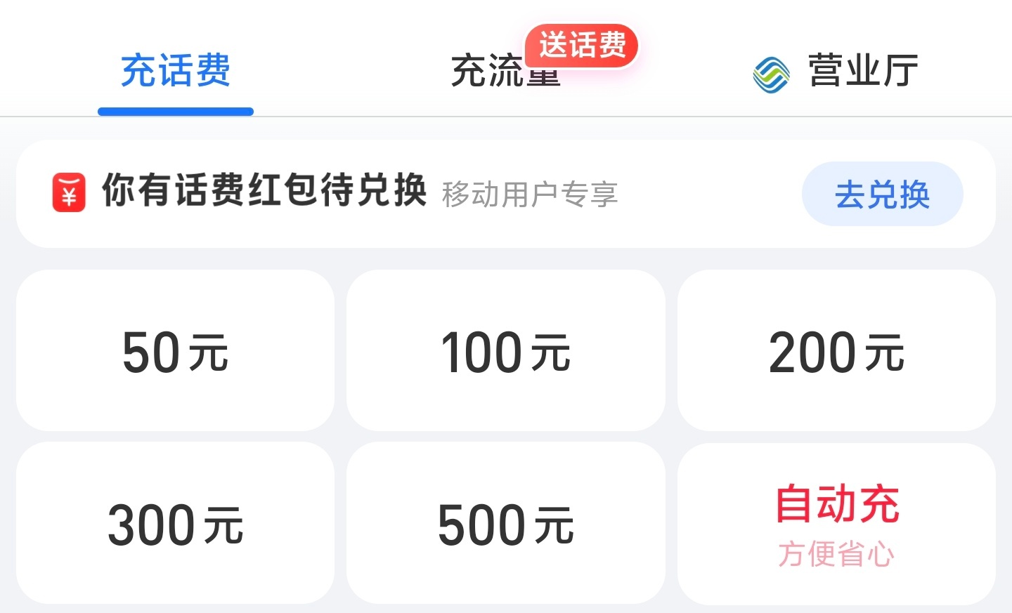 话费最低50元起充 之前还提供10元、20元的充值额度,现在基本都50元起步了,主卡充值多一些无所谓,但有一些副卡可能仅需20左右,充50有点浪费
