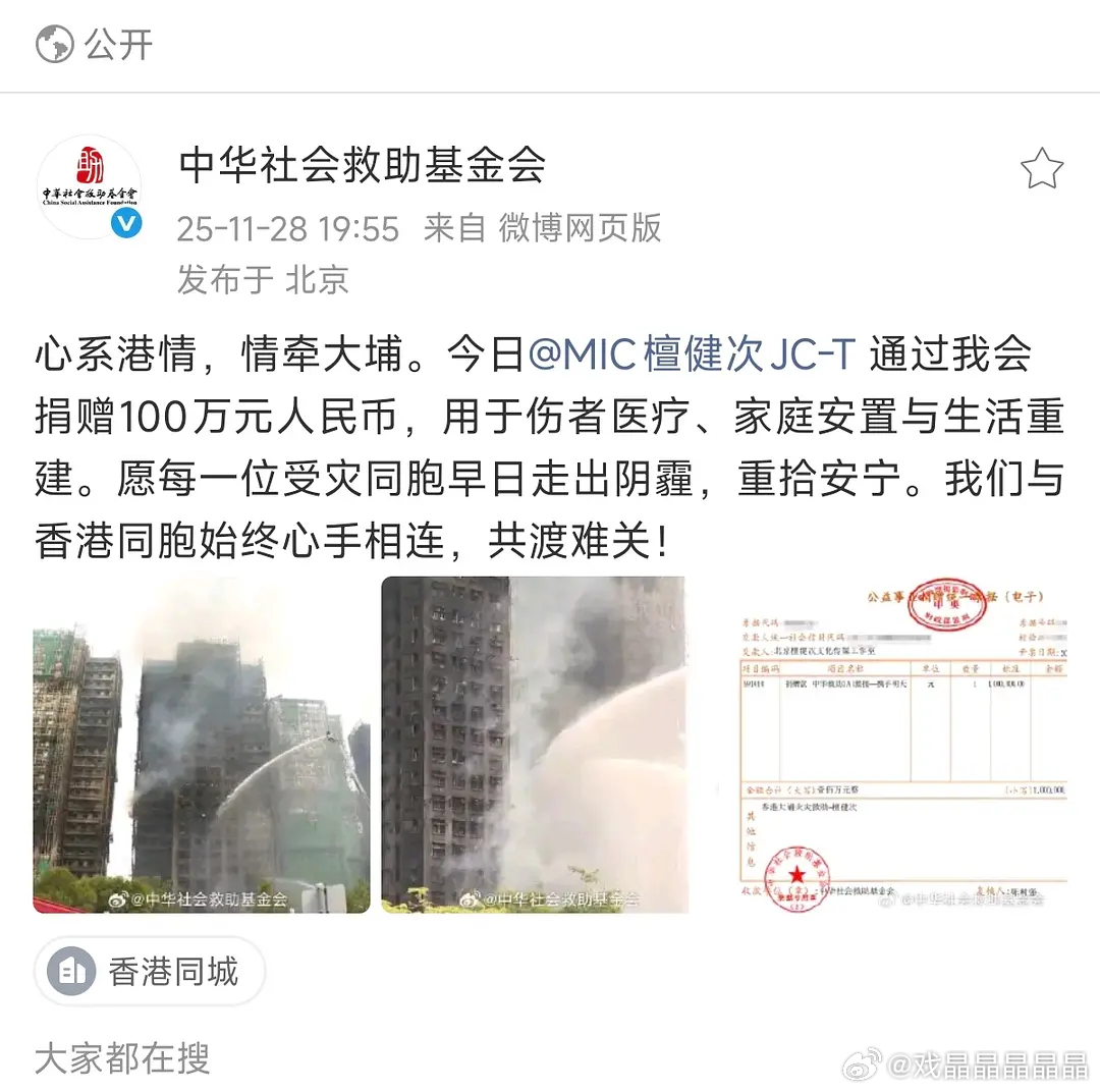 檀健次通过中华社会救助基金会向香港受灾同胞捐款100W。为同胞祈福