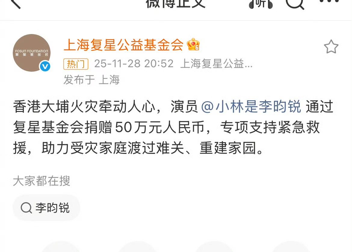 李昀锐捐款50万李昀锐为香港捐款50万李昀锐通过复星基金会捐赠50万元人民币,专项支持紧急救援,助力受灾家庭渡过难关、重建家园