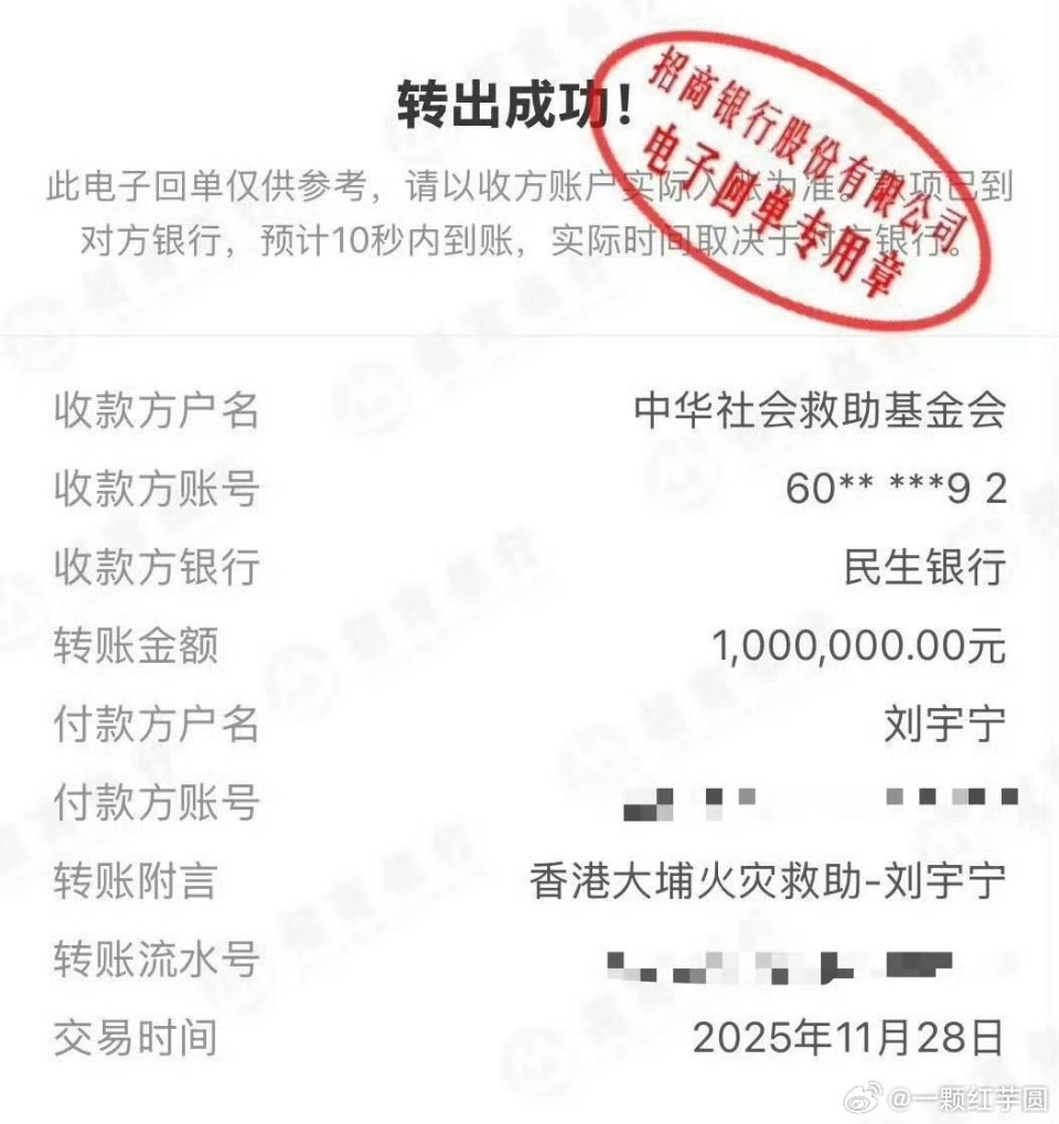 刘宇宁 使用个人账户向香港火灾居民捐赠100万!一起为他们加油