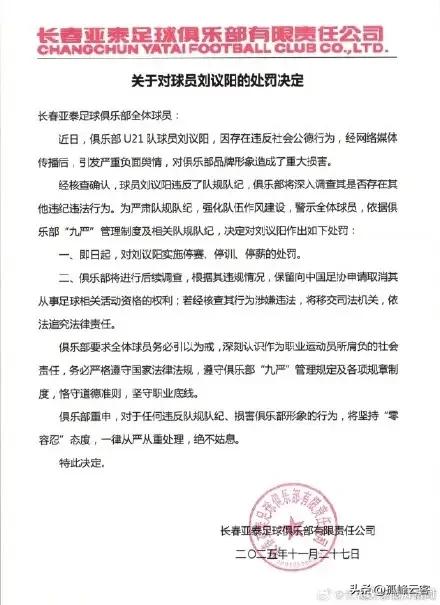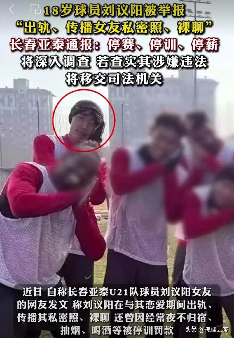 中国足球再传丑闻,又一个唐天翼出现,这次的主角换成了长春亚泰U21小将刘议阳被女友举报出轨,虽然俱乐部已经做出“三停”处罚,不过中国足球的形象已经彻底崩塌! 根据不断传出的信息刘议阳不仅存在出轨这样有违道德的行为,而且还涉嫌裸聊、自拍隐私照的行为,按照俱乐部的说法将对其行为进行调查,如果查到有违法犯罪行为将会移交司法机关追究法律责任。 前段时间曾有人举报U15球员詹景源曾出轨32岁空姐,创下中国足球球员出轨下限,不过最终以内部处理而告终。 2025年1月原国青队球员唐天翼被女友举报孕期出轨,事发后他被国青队和广州影豹开除,然而在期间曝光后,唐天翼和家人不是想着反思道歉,而是用10万元补偿逼对方堕胎结果遭到拒绝。 仅仅一年时间就爆出三名职业球员爆出“丑闻”,可见中国足球的堕落并非是在球技上,更重要的是在人品上![作揖][作揖][作揖]