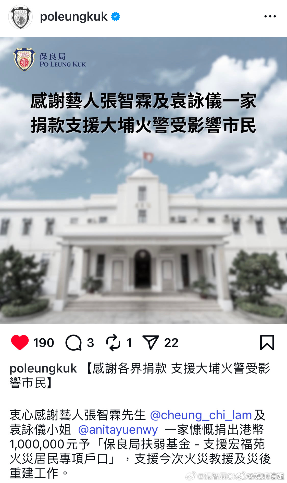 张智霖袁咏仪为香港捐款100万港币张智霖袁咏仪为香港宏福苑火灾事故捐款100万港币,支援今次火灾救援及灾后重建工作。