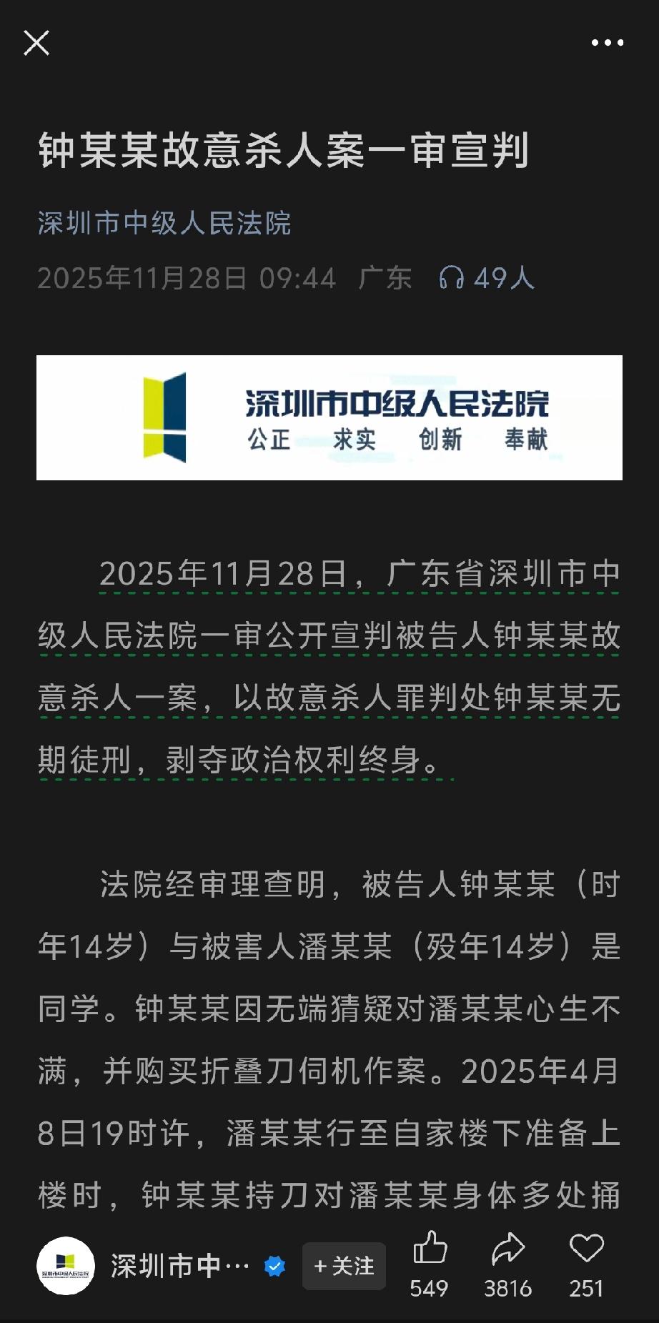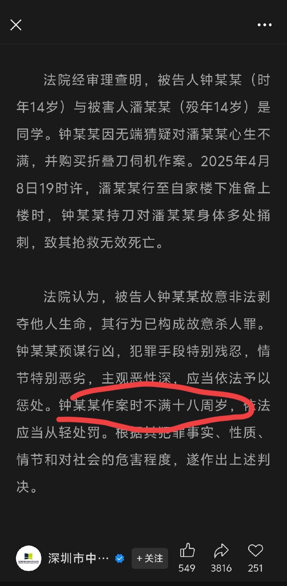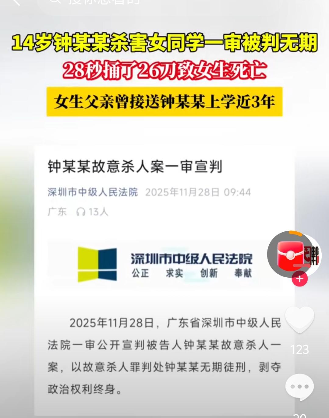 判了,让网友失望了,没有死刑! 现代版农夫与蛇的故事。 曾经免费接送他3年上学,却在路上捅了女儿26刀。这样扎心的故事,搁谁身上都会崩溃的。 由于钟某某在行凶时不满18周岁,从轻处罚,不判死刑,判无期徒刑。 关键他行凶前,还专门去搜索了法律,让他知道了,未成年人不判死刑。 大家认为,这种主观恶性,还有作案方式过分残忍的,该不该判处死刑呢? 钟某某杀同学案