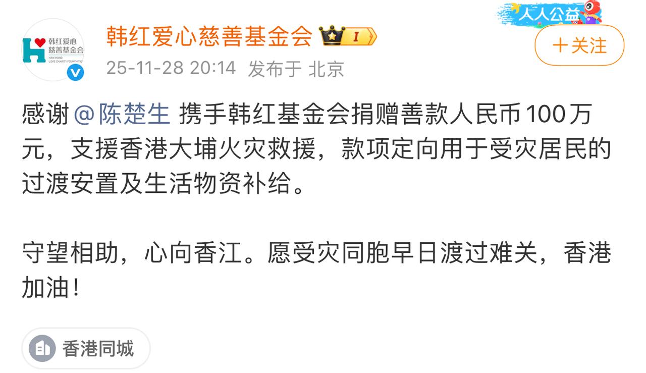 咱生哥也为香港火灾捐了100万! 一方有难、八方支援。 香港一场大火让7栋高楼的住户们没有了家。 大陆艺人纷纷慷慨解囊自发进行捐款帮助他们度过难关。 在这些艺人里,咱生哥就是通过把款打给韩红爱心慈善基金会进行捐助的,他也捐了100万! 生哥,好样的。👍