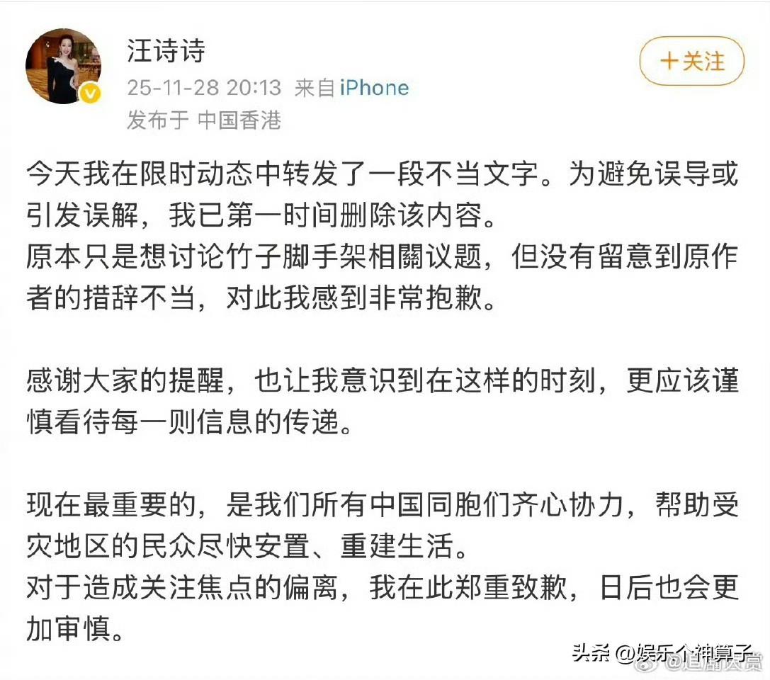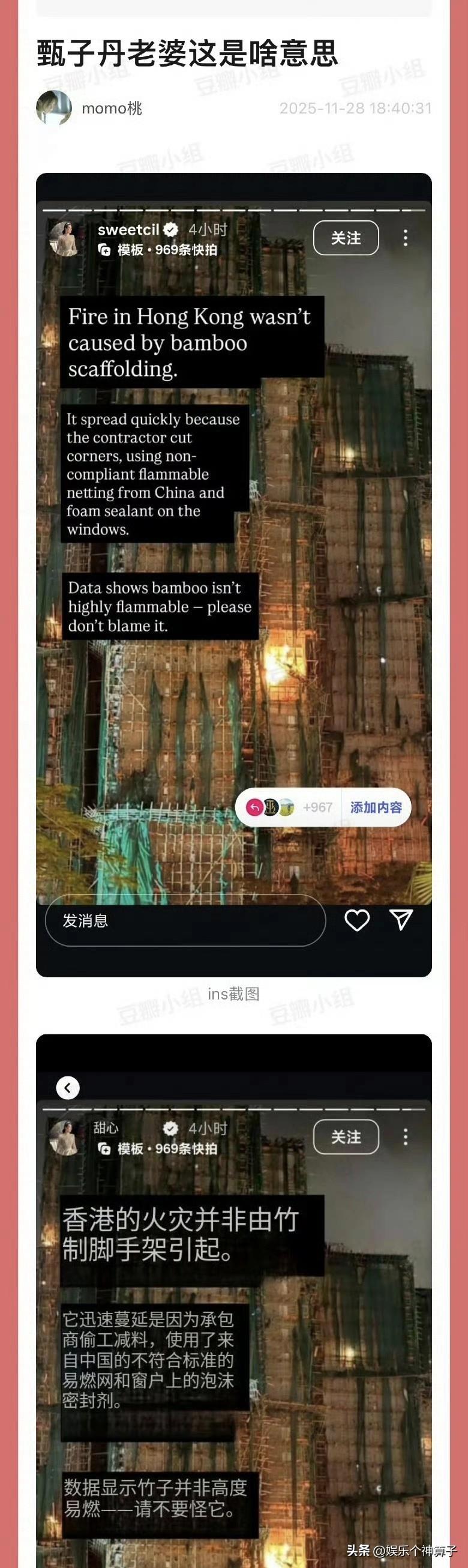 甄子丹老婆发文谈香港火灾,随后删除并道歉! 11月28日,甄子丹老婆汪诗诗在ins发文,内容谈到香港火灾,瞬间在网上引发争议,引起网友的不满。 随后,汪诗诗删除了争议内容,并在社交平台发文道歉,坦言转发内容时,没有留意原作者用措辞不当,非常抱歉。 只能说,王诗诗太大意了,转发也不仔细看内容?这……,好歹也算公众人物,应该谨言慎行。 这个时候,很多明星都在捐赠善款,帮助灾民渡过难关,还哪有闲工夫讨论这个,讨论那个呀!