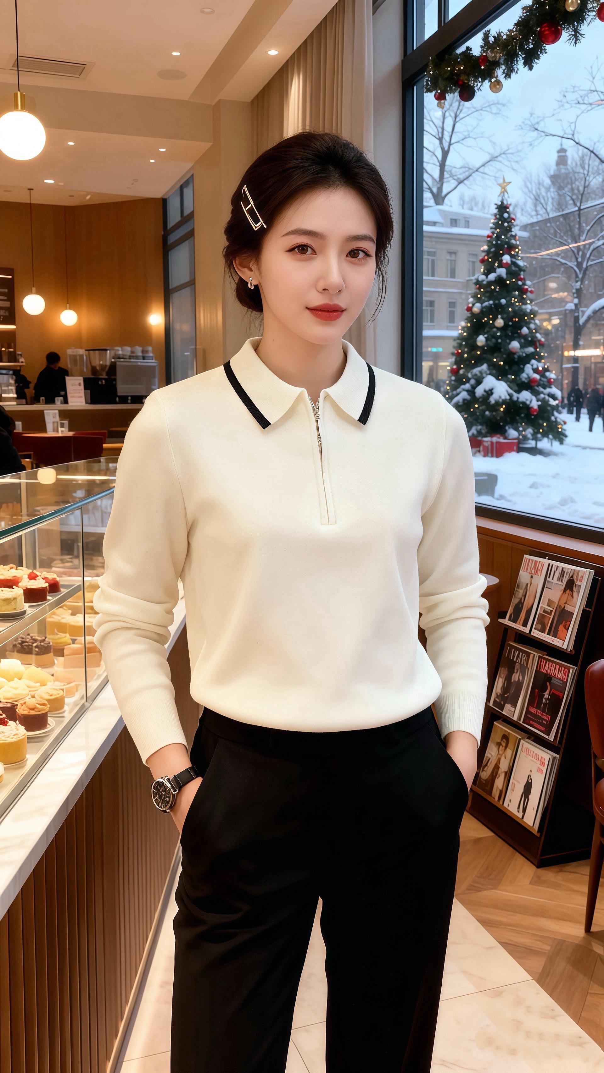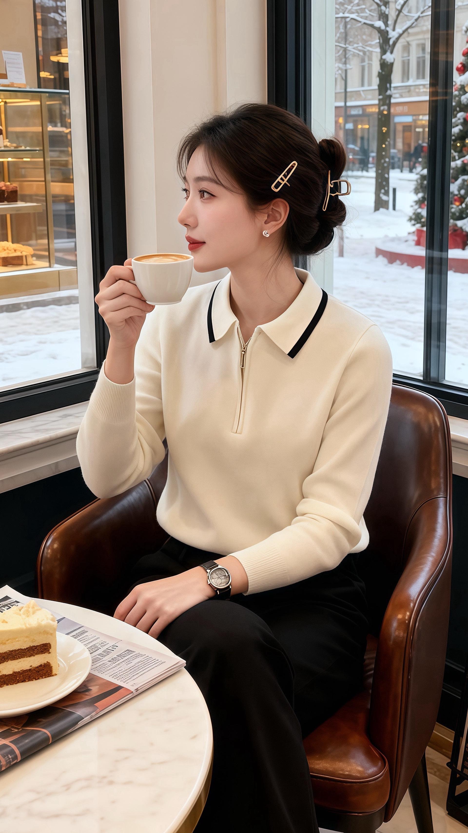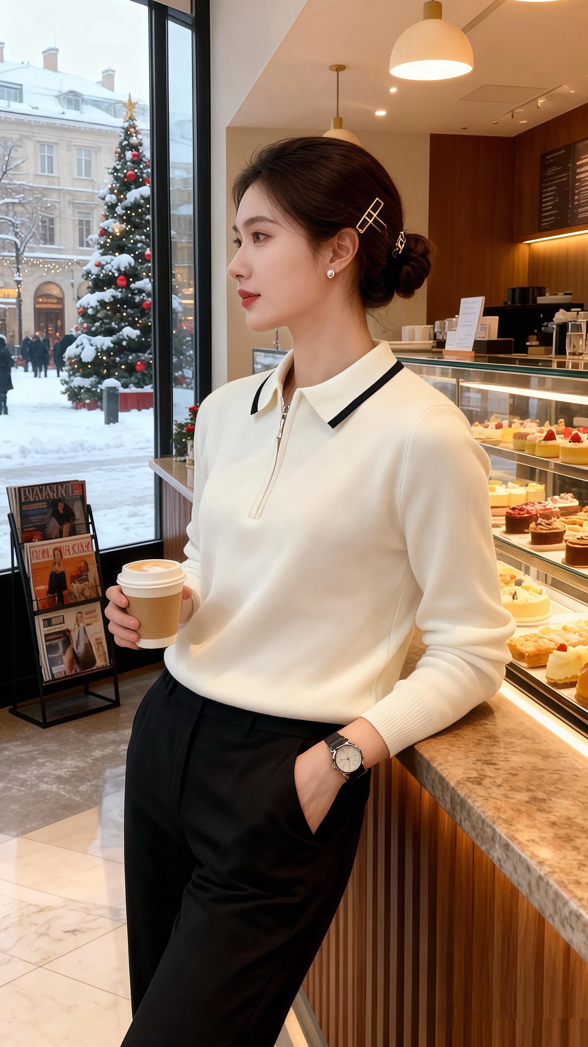 米白针织衫的翻领镶了圈细黑边,像给柔软的冬雾勾了道利落的线,半开的拉链露出一点颈线,衬得她端咖啡的手腕更细。黑裤垂感刚好,裤脚轻轻蹭过脚踝,配着她把头发松松挽在耳后,别着只银色发夹——整个人像杯热拿铁,温软里裹着点清凛的精致。