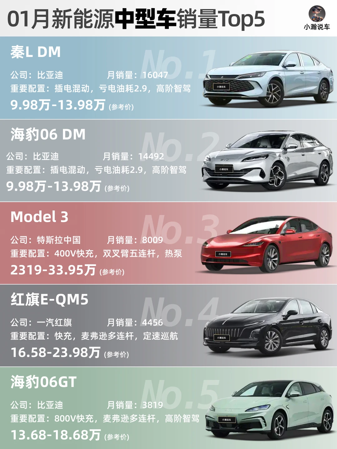 🌟中型车:比亚迪998“工业奇迹”继续领跑,有了高阶智驾加持后的表现更值得期待!model3稳居前三。