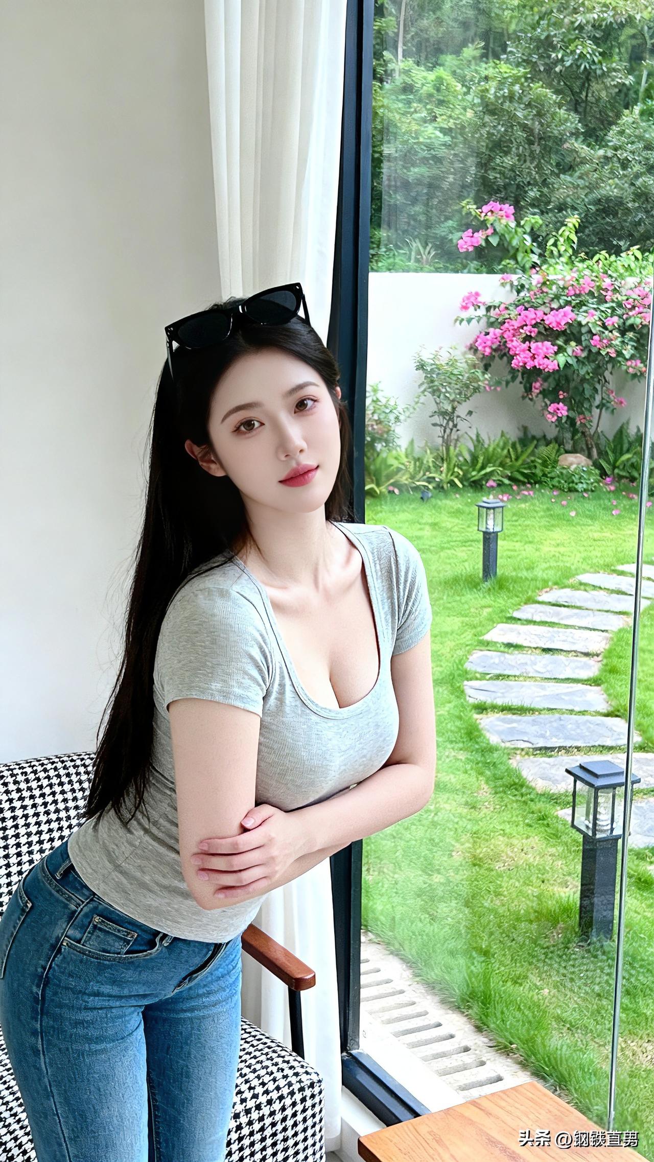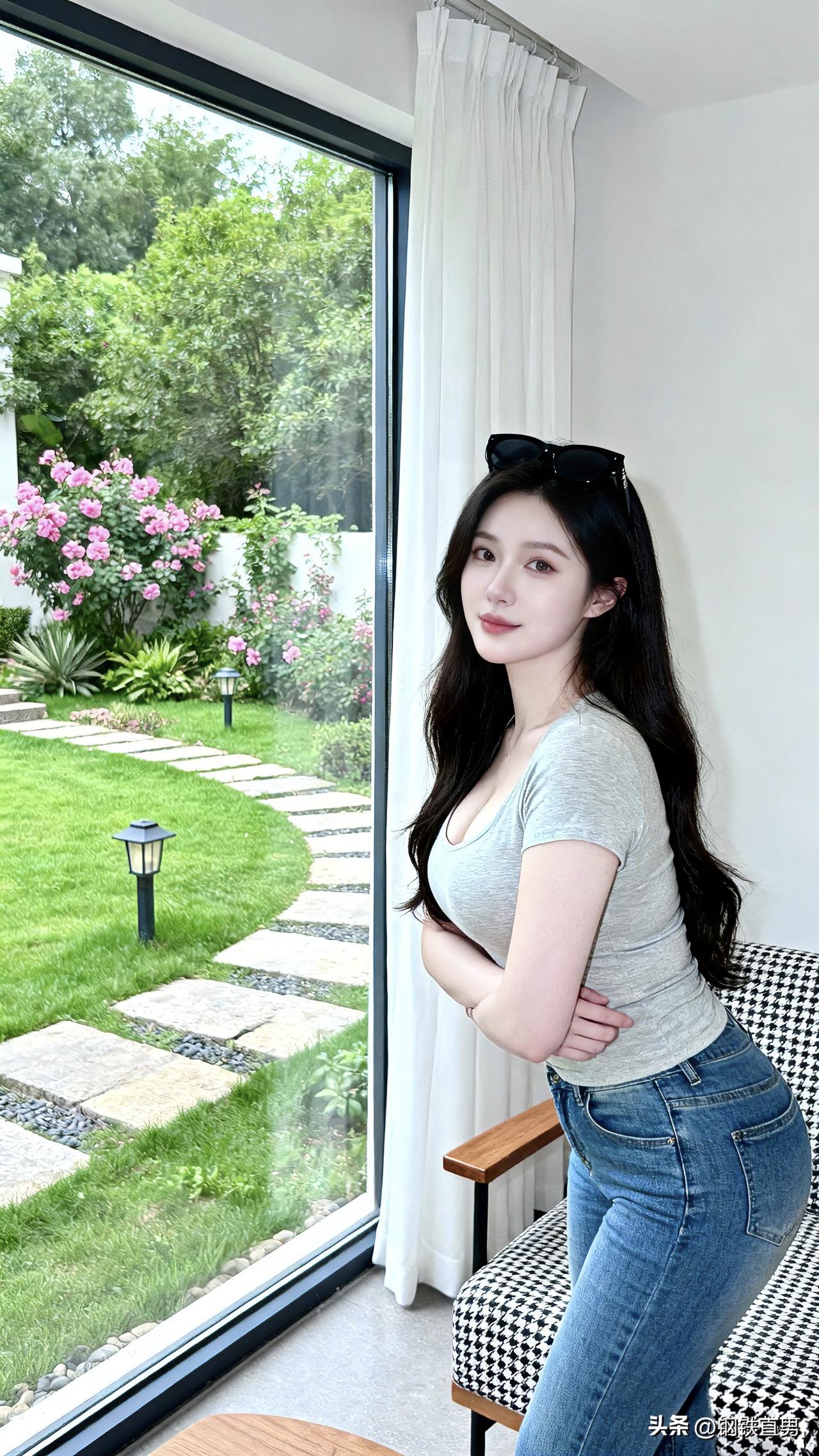 阳光明媚的午后,少女倚窗沉思,绿意盎然的庭院,静谧美好。