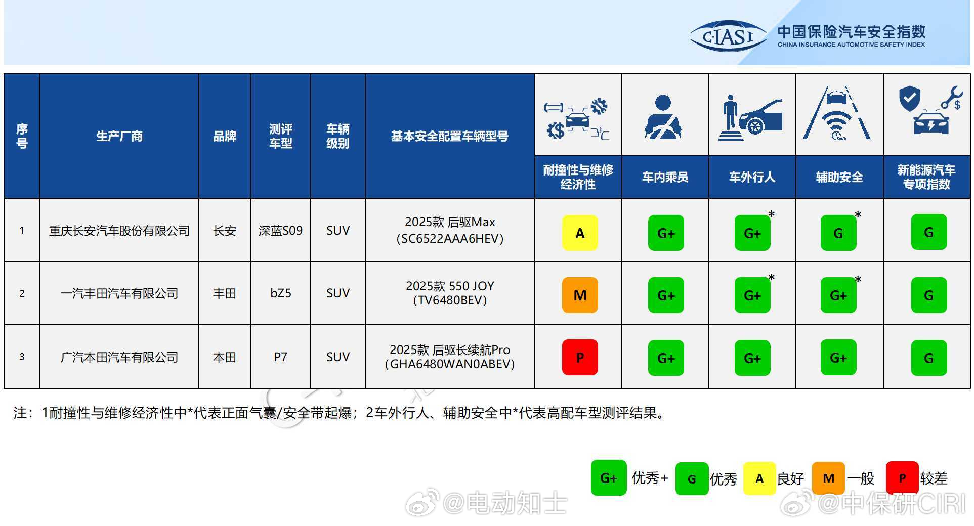 长安深蓝S09、丰田bZ5、本田P7三台车的中保研测试成绩出来了:...