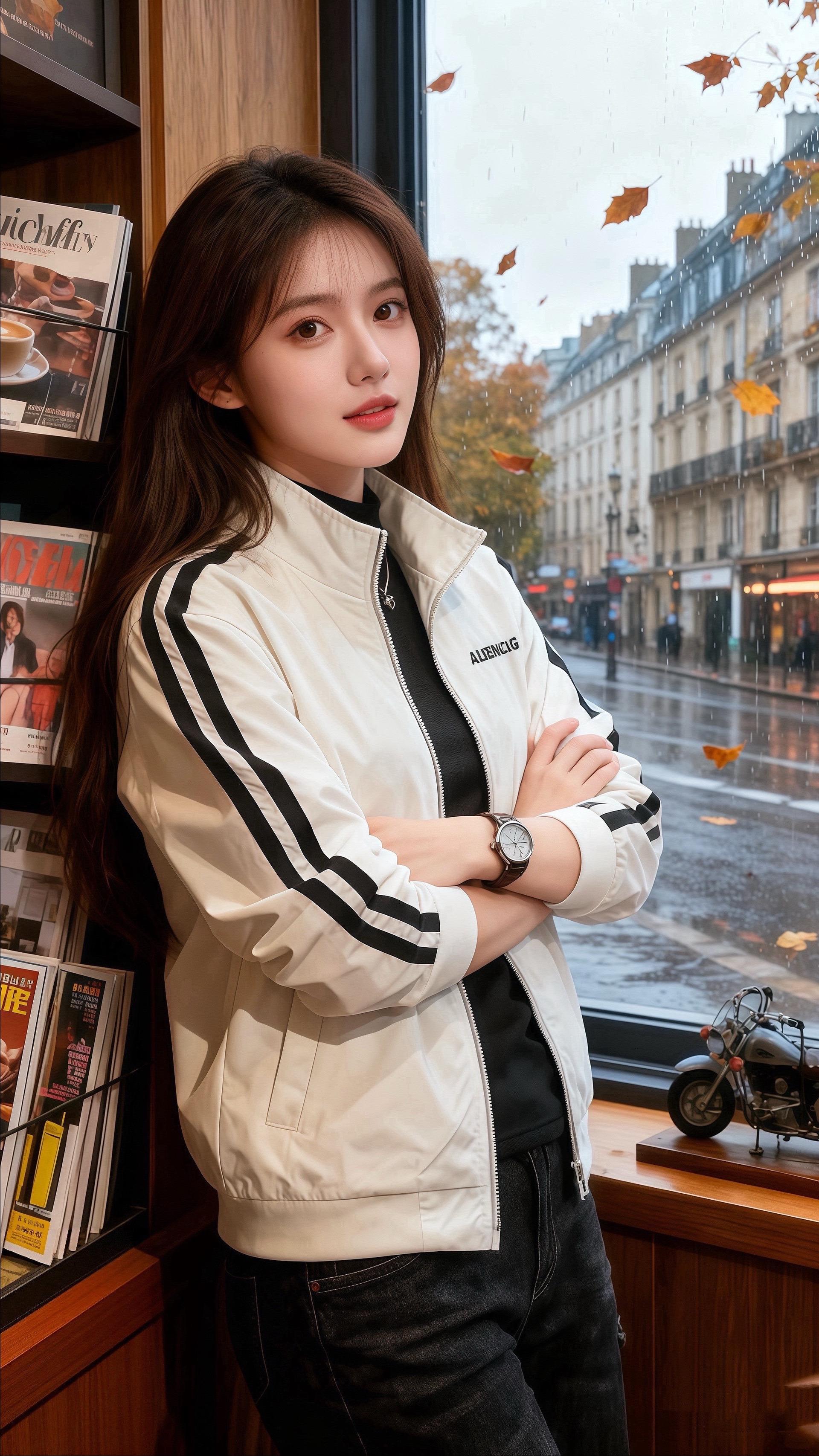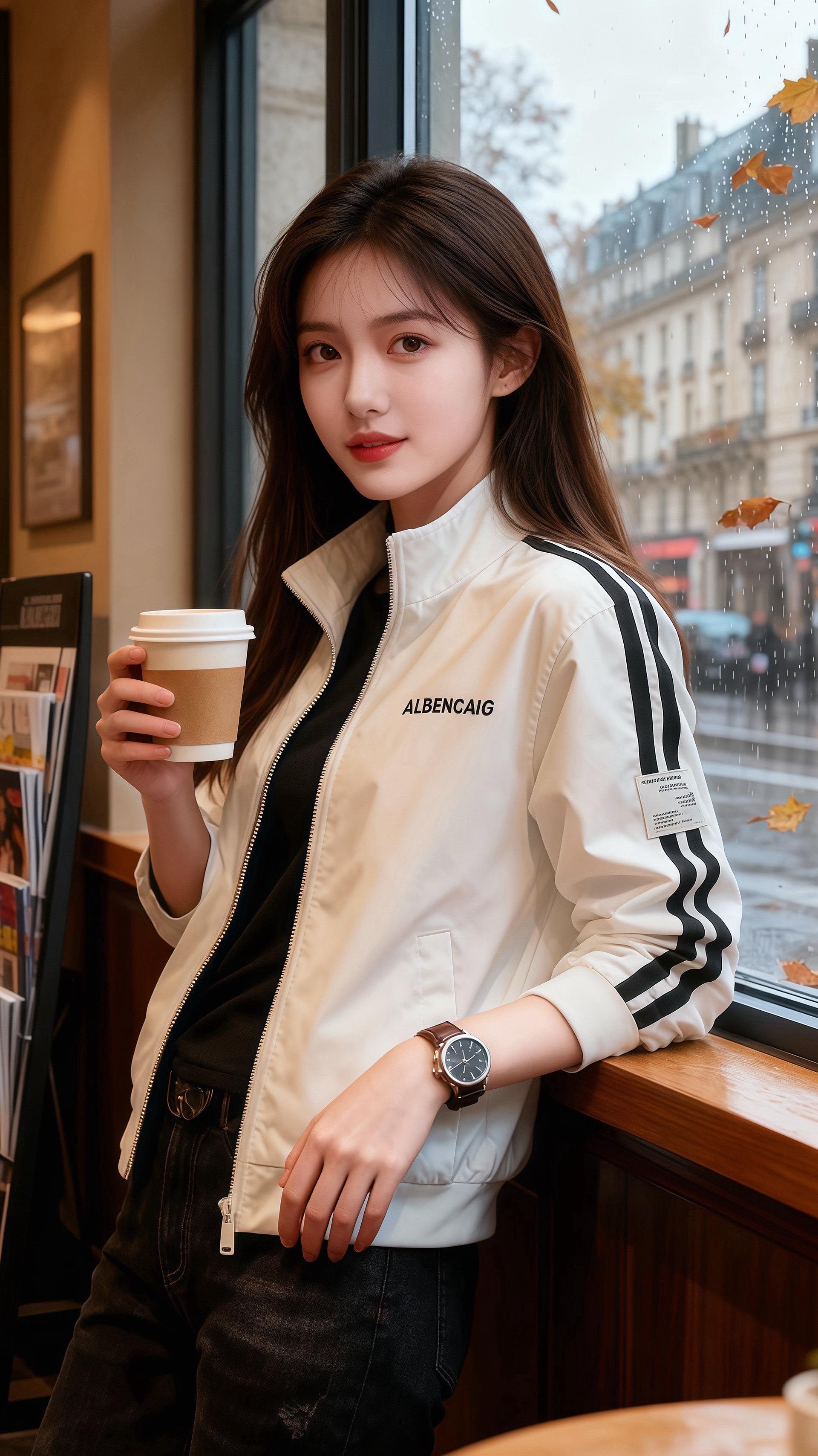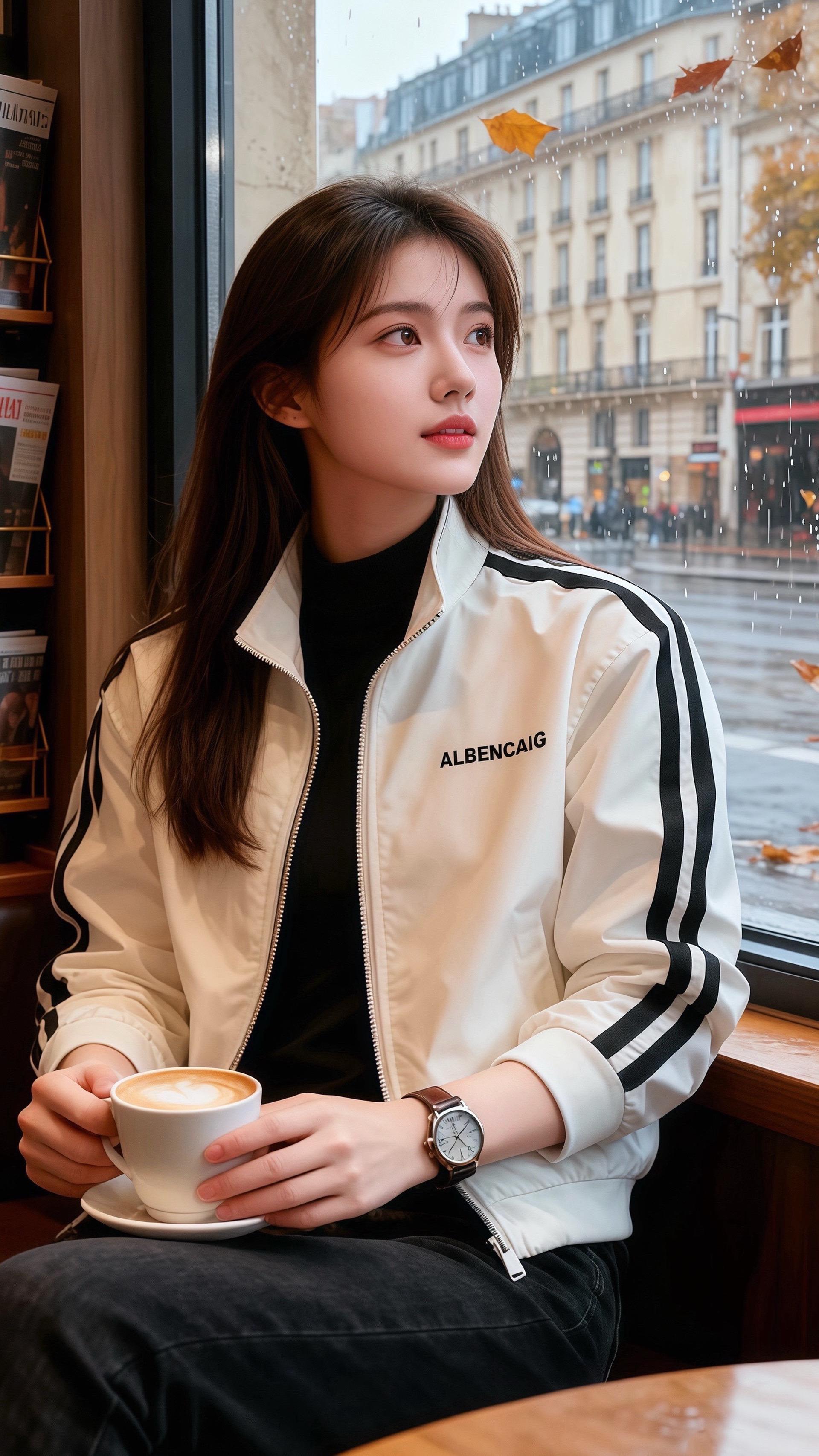 秋雨裹着桂香漫进咖啡馆时,林也注意到了窗边的苏夏——米白夹克衬得她像浸在奶泡里的拿铁,黑条纹顺着肩线落下来,像把秋日的风都裁得利落。他想起昨天在橱窗撞见她时,这件“ALBENCAIG”就亮得晃眼,连模特都成了她的背景板。