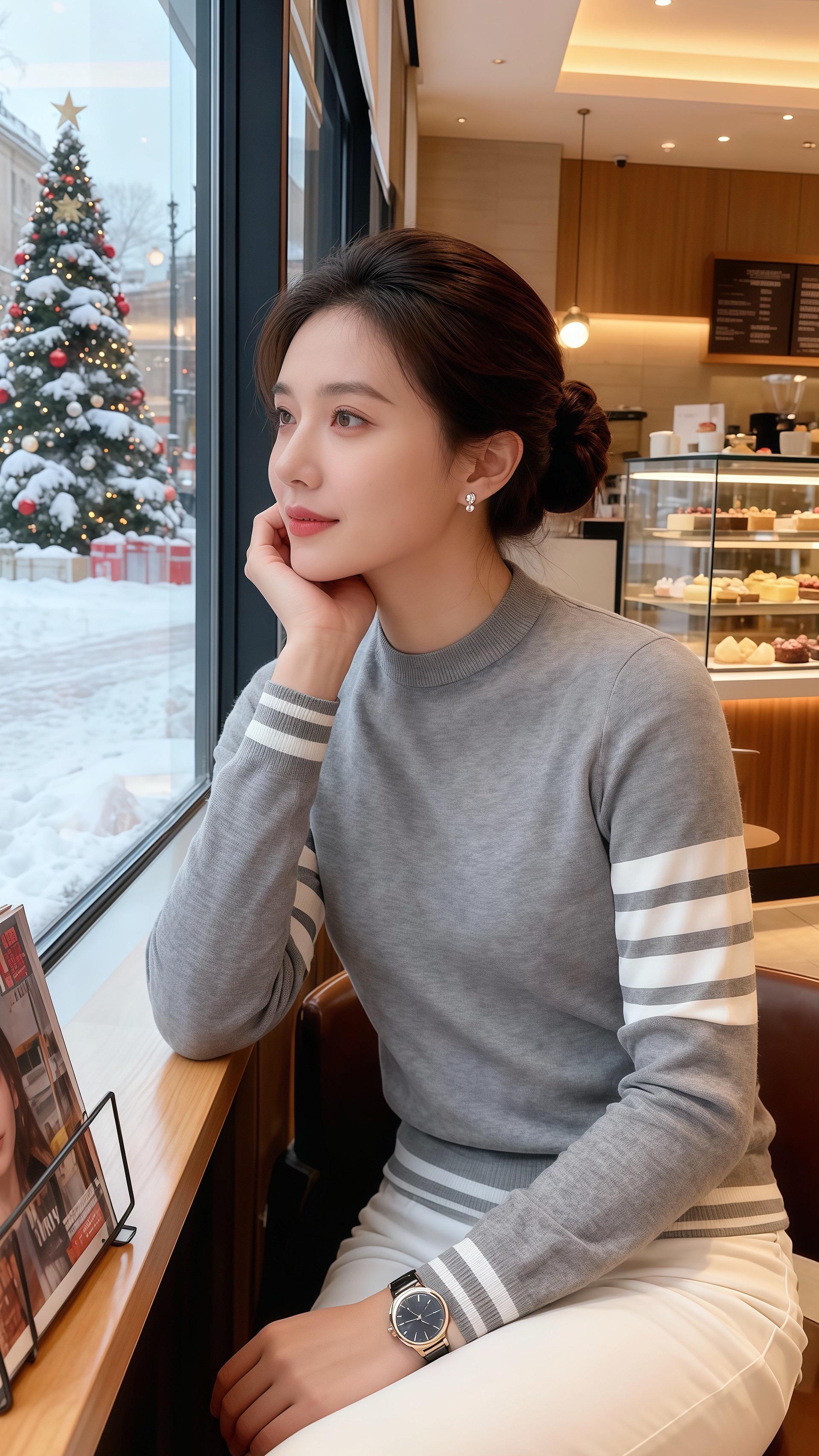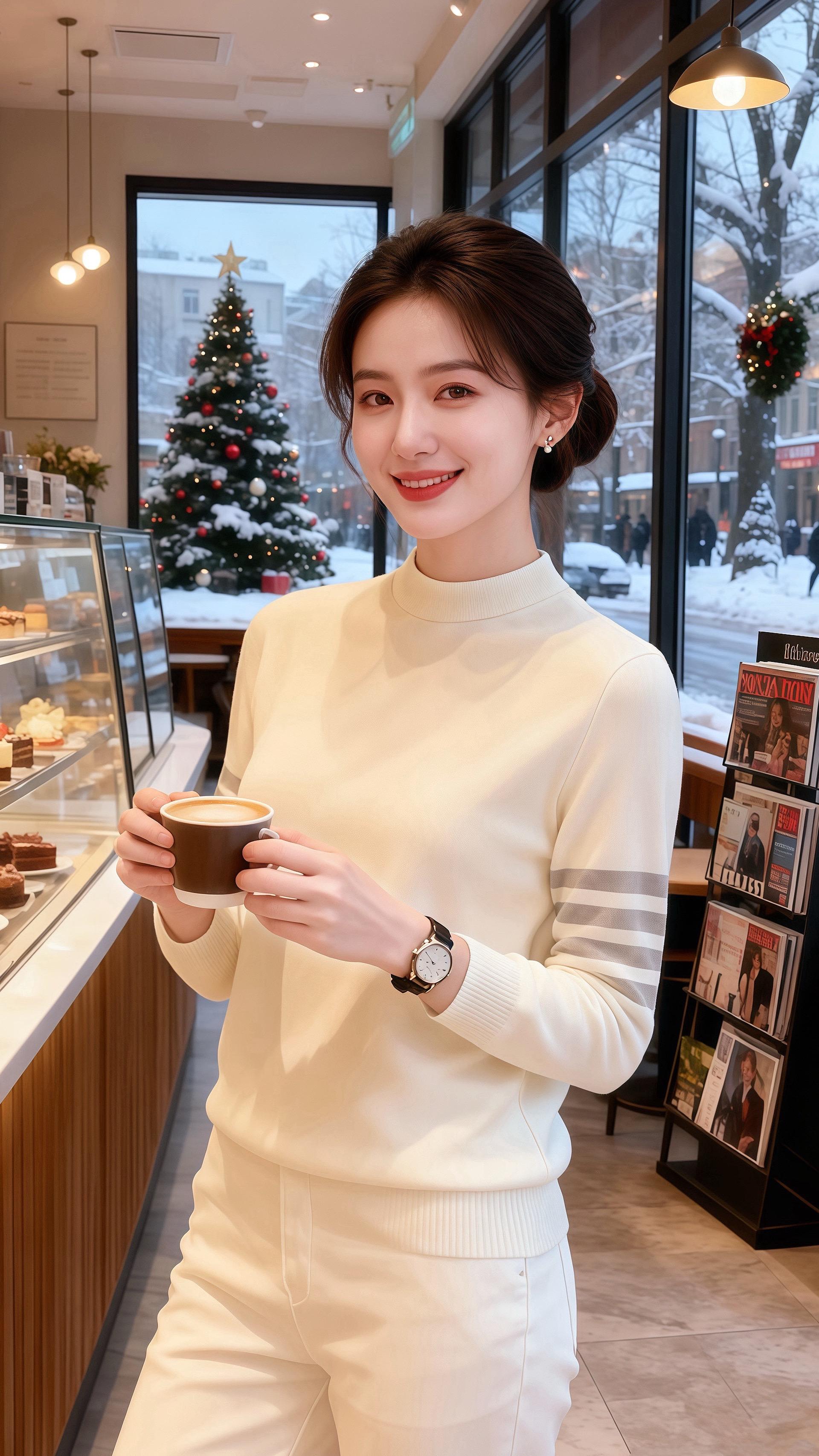 等她坐进靠窗的位置,换了件橘色针织衫翻杂志,皓明把热可可推过去:“这颜色像把刚烤好的焦糖裹在身上,连窗外的圣诞树都没你暖。”