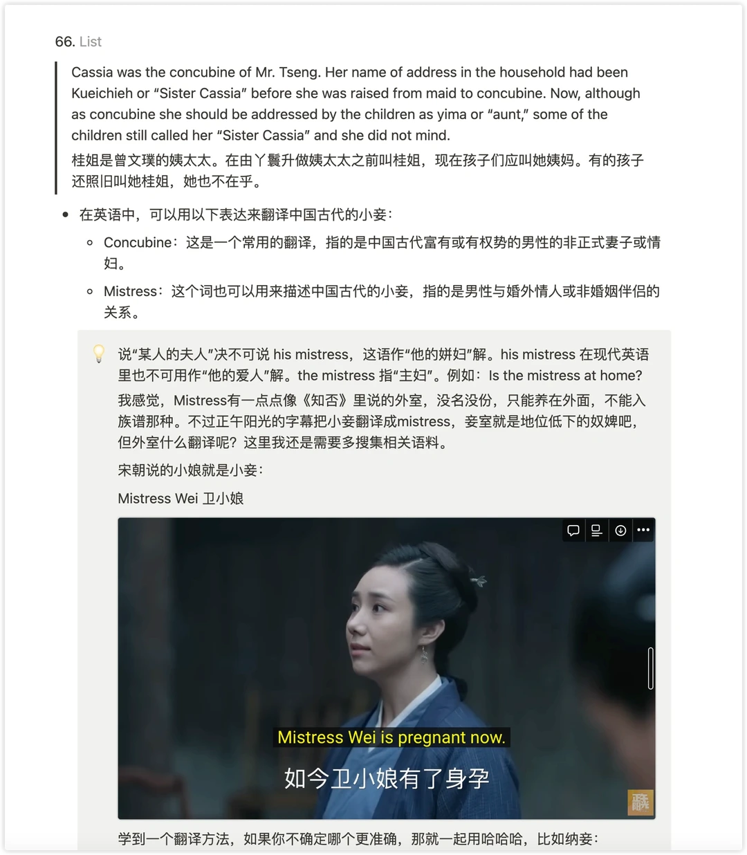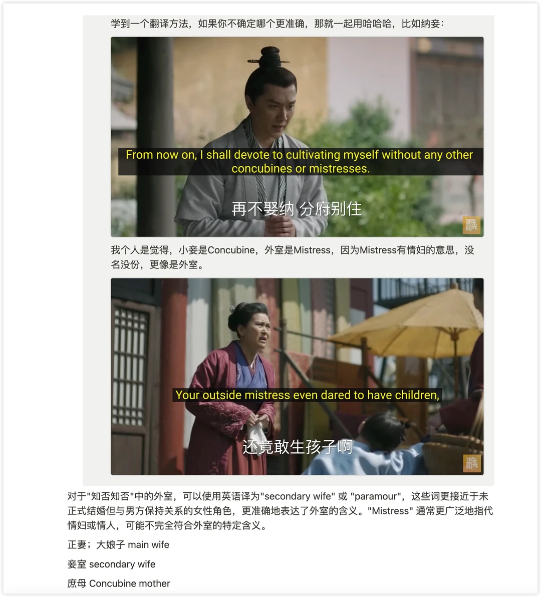 感觉Mistress有一点点像《知否》里说的外室,没名没份,只能养在外面,不能入族谱那种。不过正午的字幕把小妾翻译成mistress,妾室就是地位低下的奴婢吧。