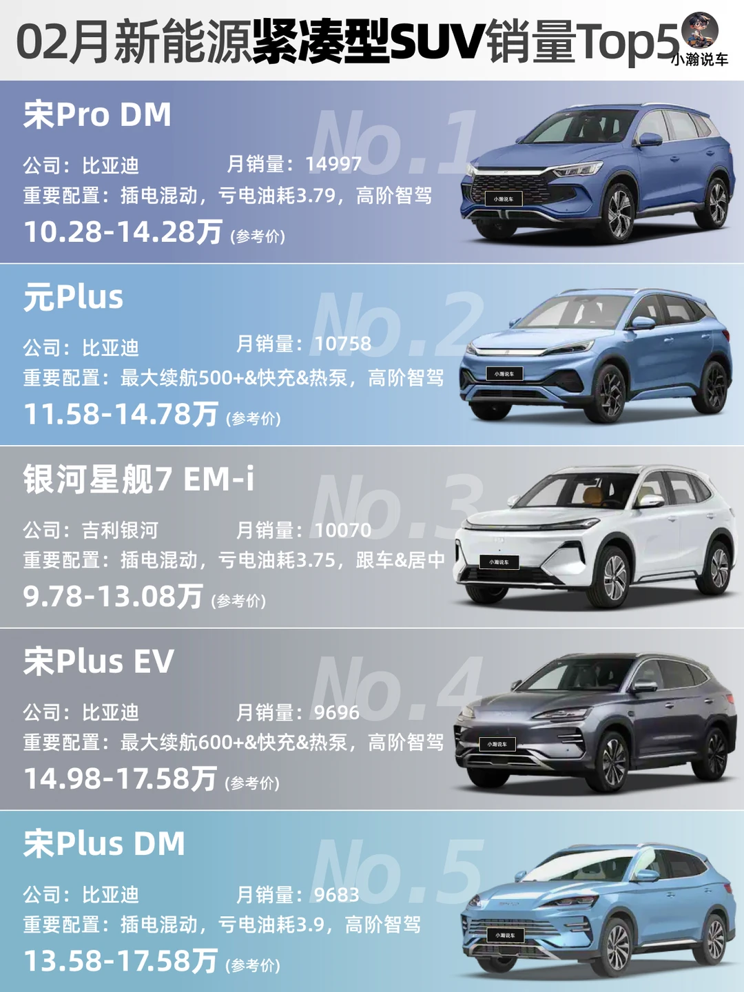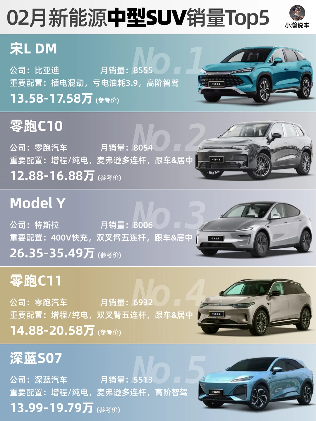 🌟中型SUV:ModelY本月销量跌破1万,被宋L DM和零跑C10超越!零跑C11和深蓝S07上榜。