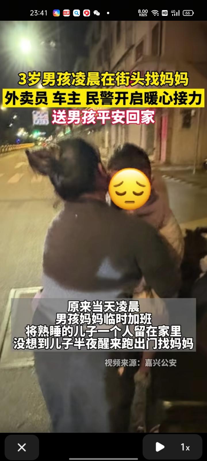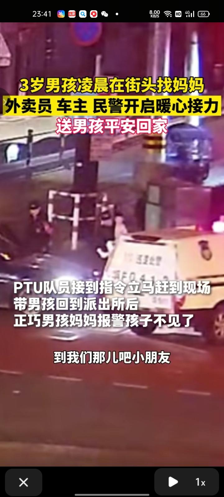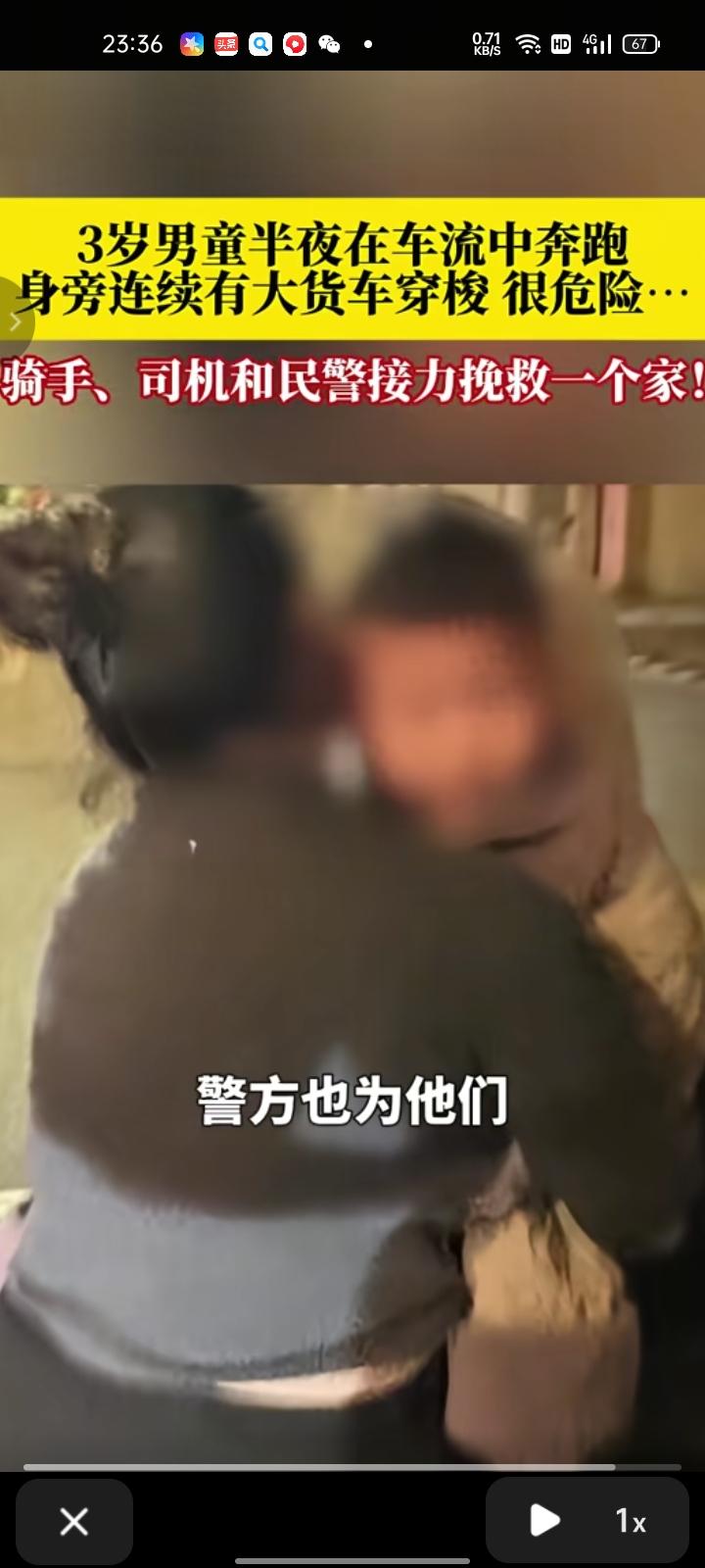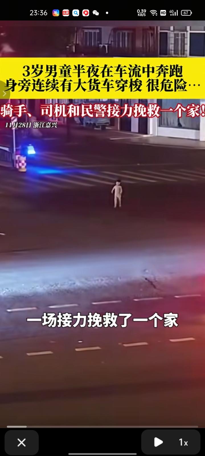 11月27日,浙江嘉兴。凌晨三点,车来车往的道路上出现一个光脚丫的小孩,被车撞到后果不堪设想,万幸一位外卖小哥正好路过,直接把车横在孩子面前,用身体挡住车流。他立马报警,又脱下自己的外套裹住冻得发抖的小孩。 这还没完,后面又来了一辆私家车,车主看到这一情况,立马打开车门喊“快抱孩子上来暖暖”。PTU队员接到指令后把小孩带到派出所,恰好男孩妈妈报警孩子不见了。原来,男孩妈妈临时加班,将熟睡的儿子一个人留在家里,没想到儿子半夜醒来跑出门找妈妈。 真正的善良不是嘴上说说,是看到危险时敢站出来,是陌生人遇难时伸出援手。这个世界破破烂烂,总有人缝缝补补。
