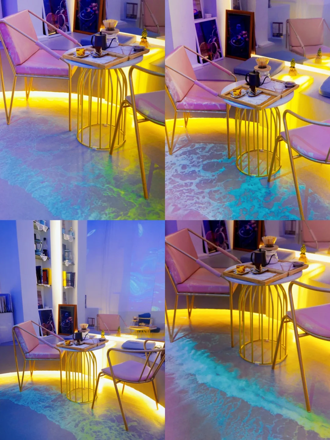 咖啡厅的室内,则是沉浸在梦幻浪漫中,投影在地上的海水,随着音乐激起一阵阵浪花🌊🌊