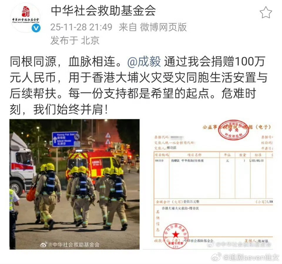 成毅个人捐赠100万元人民币,用于香港大埔火灾受灾同胞生活安置与后续帮扶,危难时刻,始终并肩,愿同胞平安健康。明星捐款