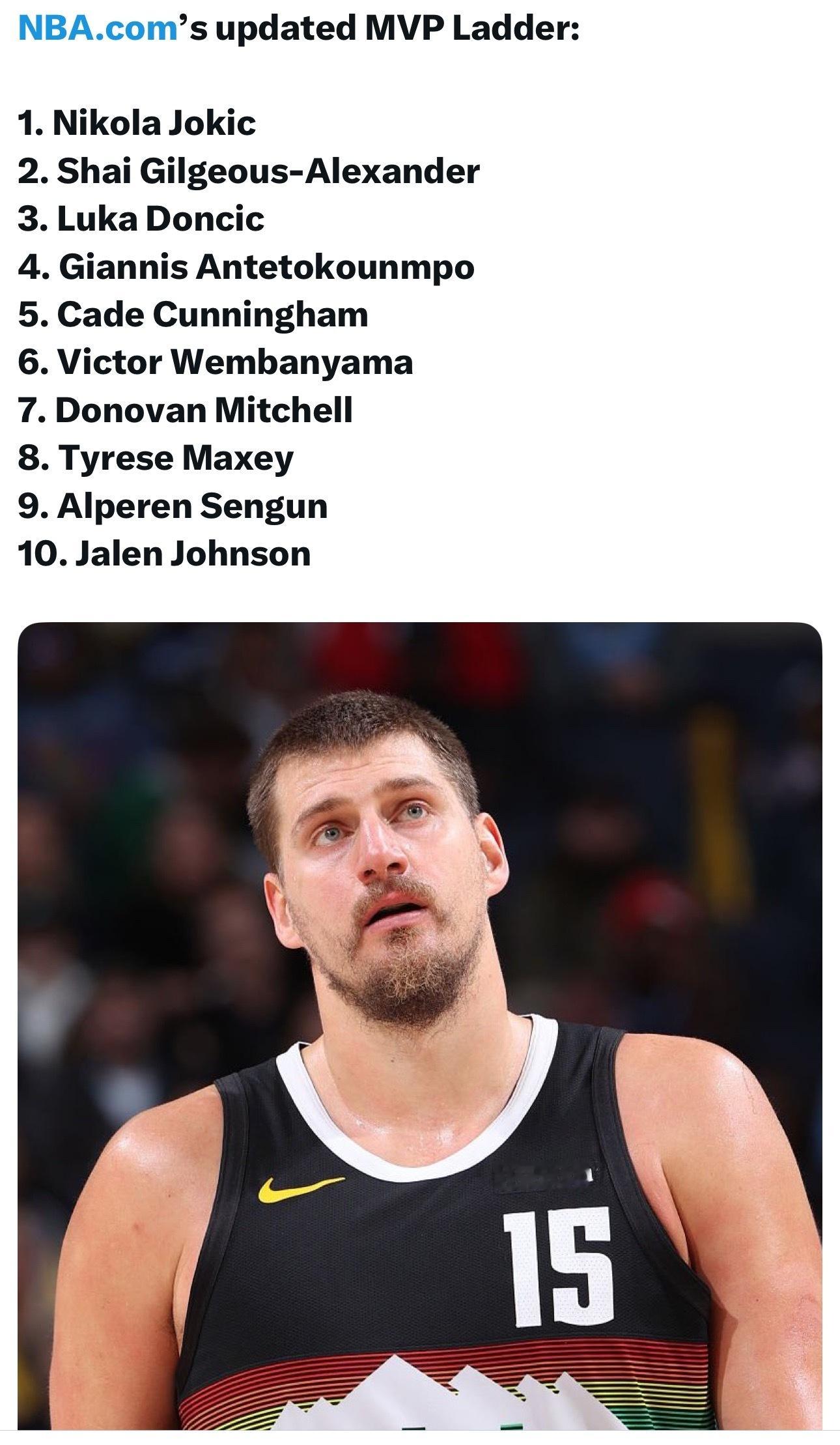 NBA官网更新MVP榜,约基奇、亚历山大、东契奇继续占据前三位。
