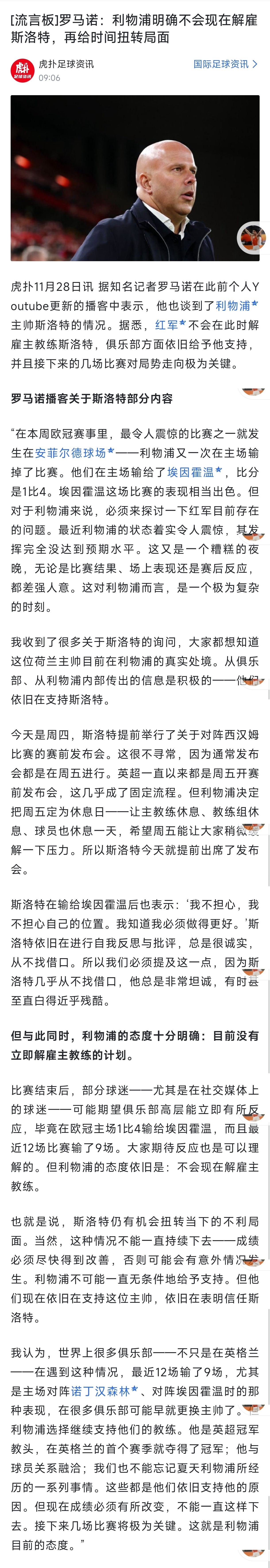 这个新闻,基本上已经预示斯洛特要被解雇了。没有立刻解雇,只是现在俱乐部还没有找到替代者。利物浦