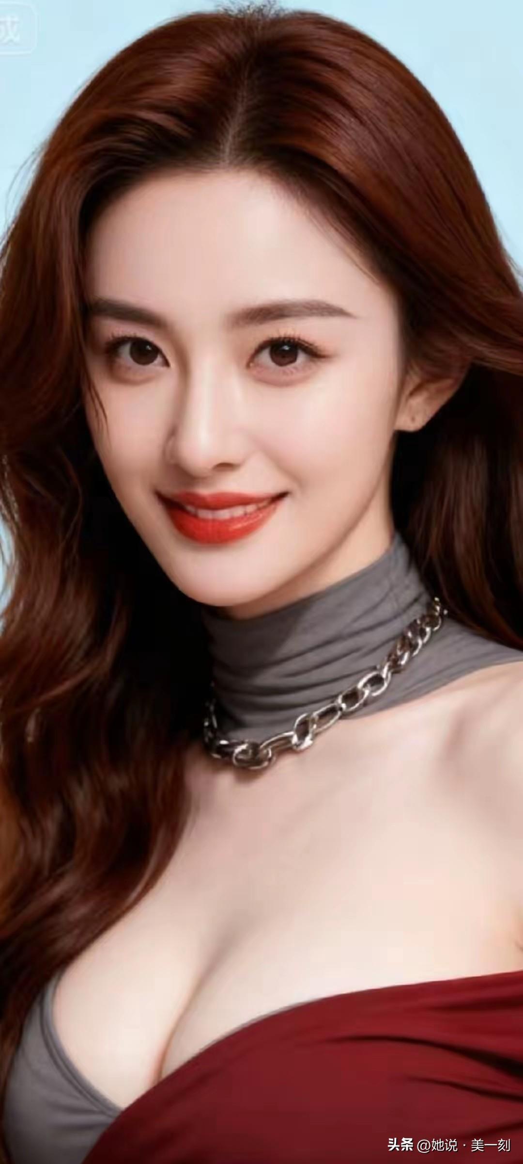 红衣美人笑,银链映芳颜。说出你认为最漂亮的女人 优雅红唇,时尚链条,迷人微笑,气质女神