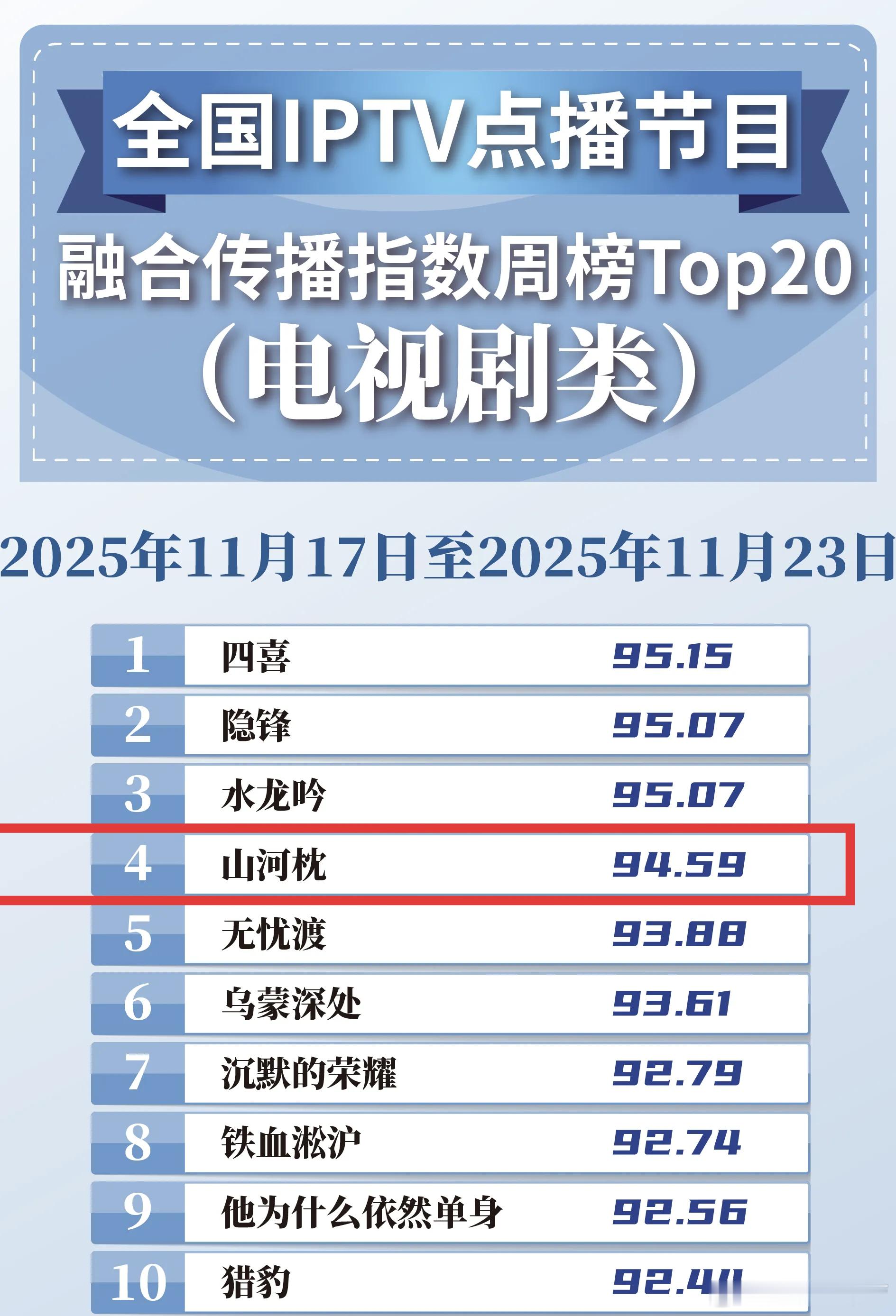 上周全国IPTV点播节目融合传播指数周榜Top20——已收官的《山河枕》,高分位列周榜第四!山河枕宋茜山河枕
