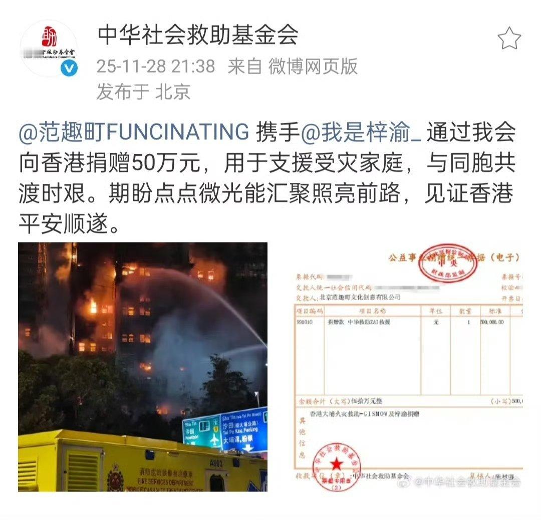 梓渝向香港捐款50万元在这个特别时刻,梓渝用善款传递正能量,用实际行动支持香港。为这份爱心点赞!