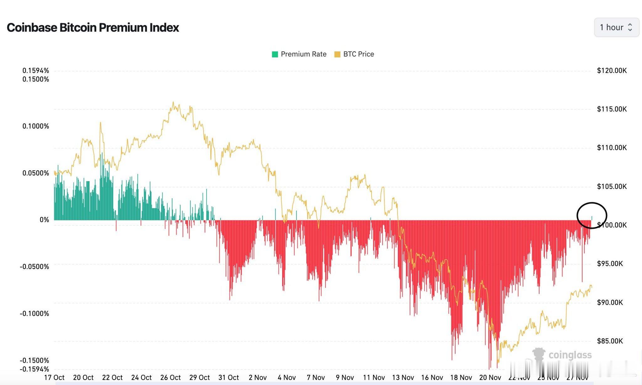 💥最新消息:Coinbase比特币溢价转绿美国机构再次开始买入✅比特币加